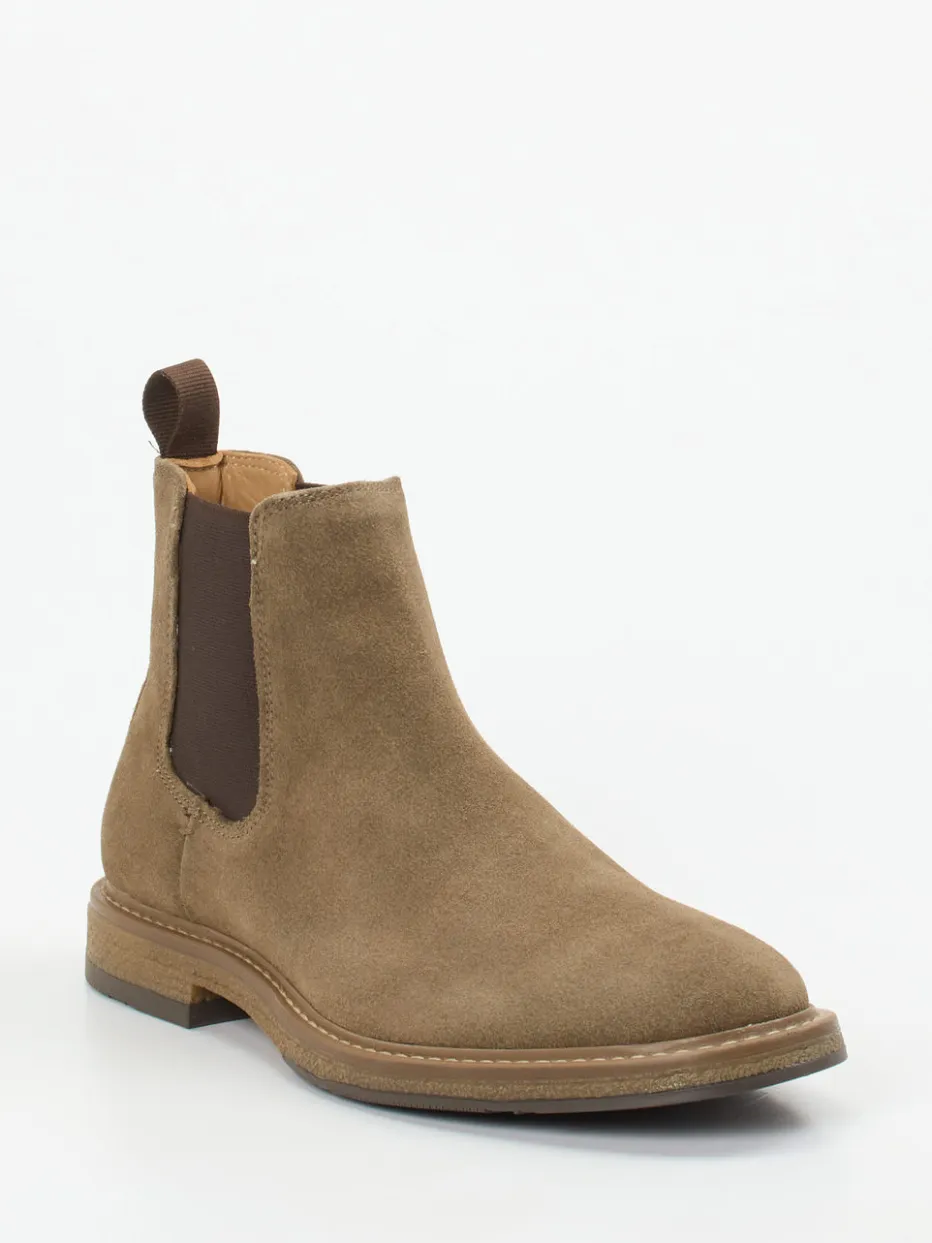 Ideal für urbane Wege und dezente Office-Looks: Das samtig angeschliffene Veloursleder in sandigem Braunton sorgt für einen edlen, matten Look. Typisch für die Chelsea-Form sind die seitlichen Elastikeinsätze und die praktische Zuglasche. Die rahmengenähte Gummisohle bietet Stabilität, während das Leder-/Textilfutter für Komfort steht. Dezente Ton-in-Ton-Nähte unterstreichen das minimalistische Design, das sich mühelos kombinieren lässt – etwa mit Chinos oder Wollhosen. Modisch greifen die Boots den „Quiet Luxury“-Trend auf.