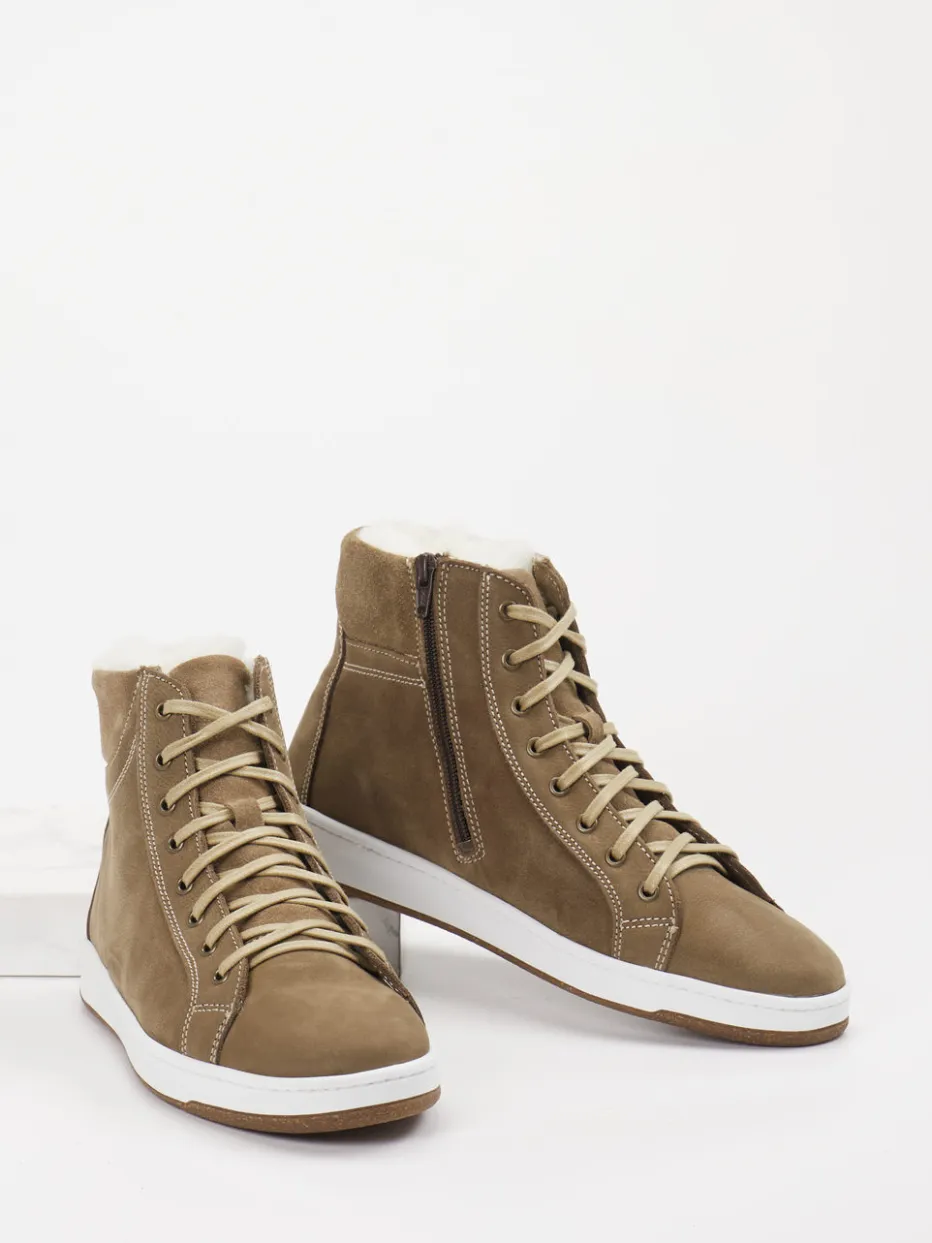 Dieser High-Top-Sneaker von Ralph Harrison Country vereint eine matte Lederoptik in Naturtönen mit funktionalem Innenfutter – ideal für kalte Tage mit stilvollem Anspruch.