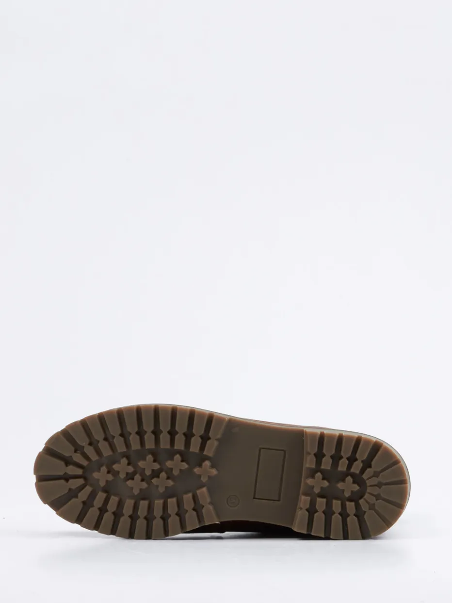 Für Wege abseits des Asphalts.Ralph Harrison Country präsentiert rustikale Schnürboots für den Outdoor-Alltag. Ideal bei herbstlicher Witterung überzeugen diese Boots mit fester Konstruktion und komfortablem Schaft. Das rehbraune Juchtenleder – ein Fettleder mit natürlichem Glanz – wird durch samtig angerautes Veloursleder ergänzt. Die bronzefarbenen Metallösen und die markante Profilsohle unterstreichen den Workwear-Charakter, während Kontrastnähte und klare Linienführung das Design prägen. Mit ihrer robusten Silhouette und Gorpcore-Ästhetik passen sie ideal zu funktionalen Layering-Looks und erdfarbenen Jacken. Hochwertiger Country-Style in handwerklich inspirierter Outdoor-Umsetzung.