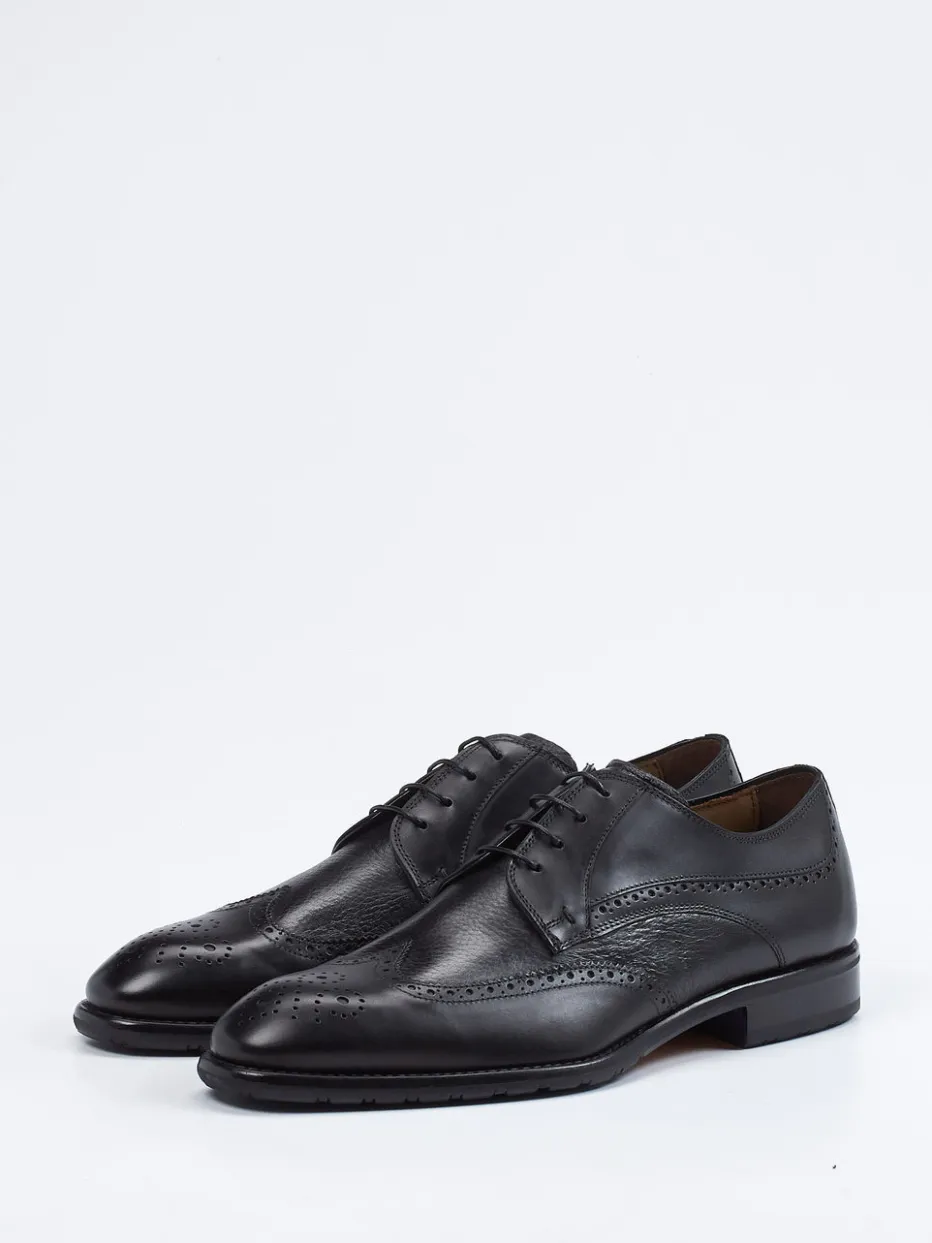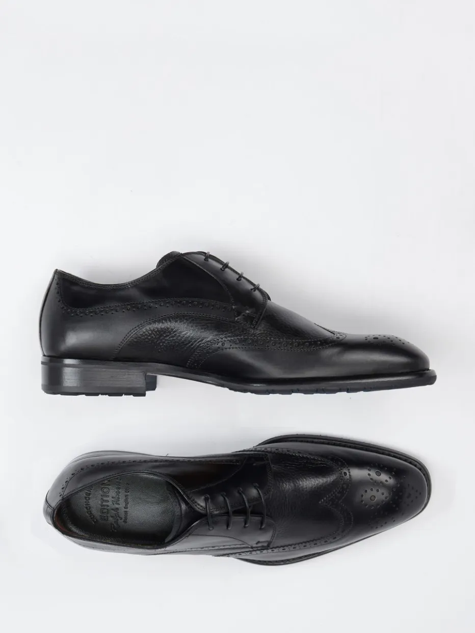Stilvoller Klassiker für moderne Herrengarderoben.Ralph Harrison Edition präsentiert einen hochwertigen Herrenschnürschuh in Brogue-Optik. Im Alltag wie zu festlichen Anlässen überzeugt das Modell durch schwarzes, strukturiertes Hirschleder mit samtigem Glanz und klassischer Linienführung. Die Lochverzierungen im Brogue-Stil vereinen traditionelle Handwerkskunst mit zeitgemäßer Eleganz. Eine durchgenähte und profilierte Gummi-Ledersohle sorgt für Trittsicherheit. Innen rundet feines Kalblederfutter das Tragegefühl ab. Der Schuh passt besonders zu klassischen Anzügen oder edlen Wollhosen. Ein charakterstarker Begleiter im Zeichen von „Quiet Luxury“.