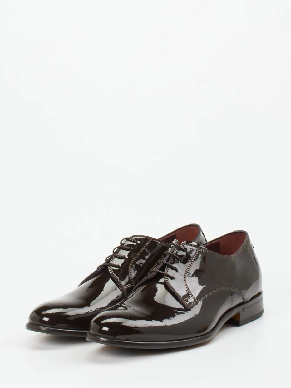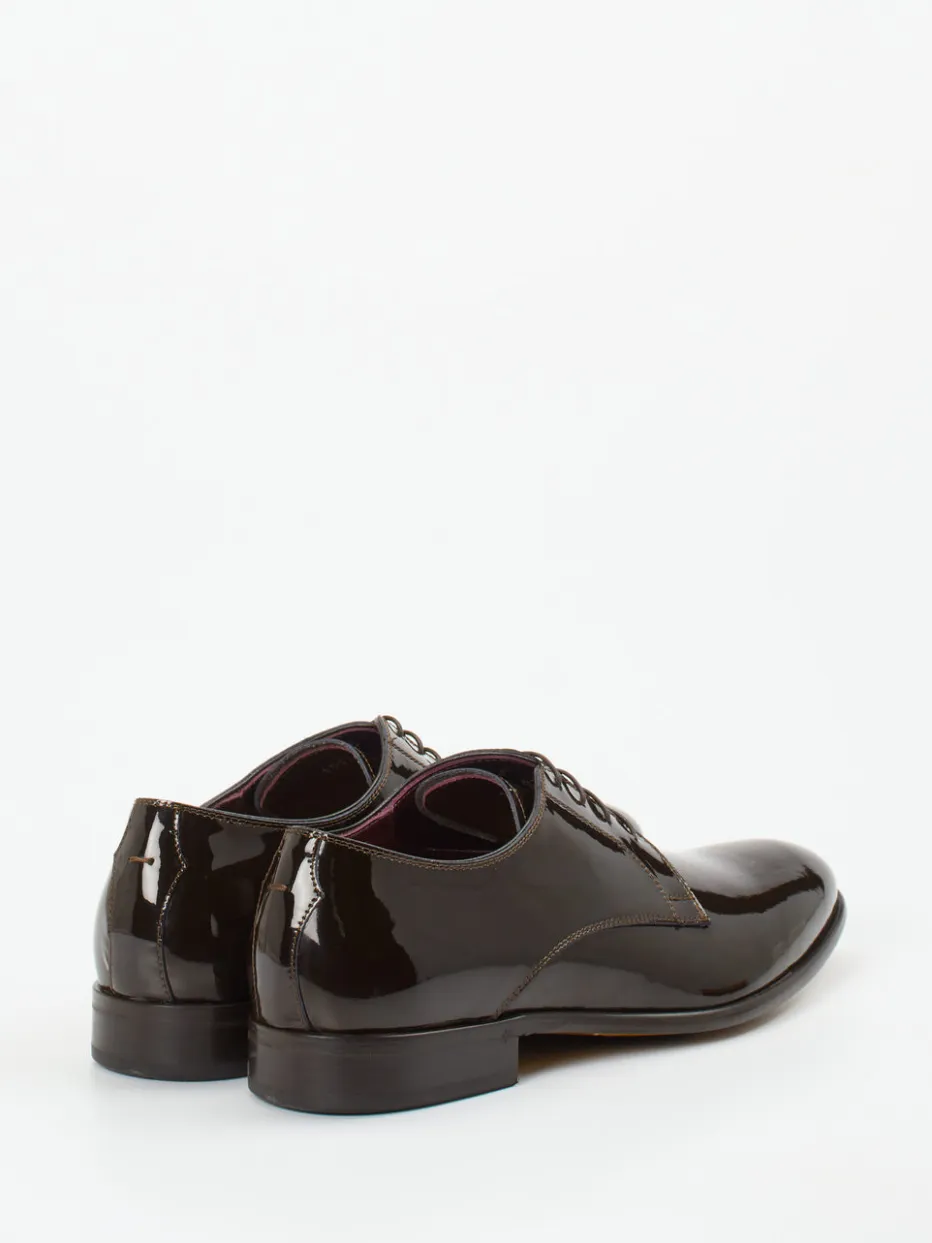 Dieser Derby aus hochglänzendem, braunem Lackleder verbindet klassische Formensprache mit moderner Festlichkeit. Handgefertigt in Italien – ein eleganter Begleiter für besondere Anlässe.