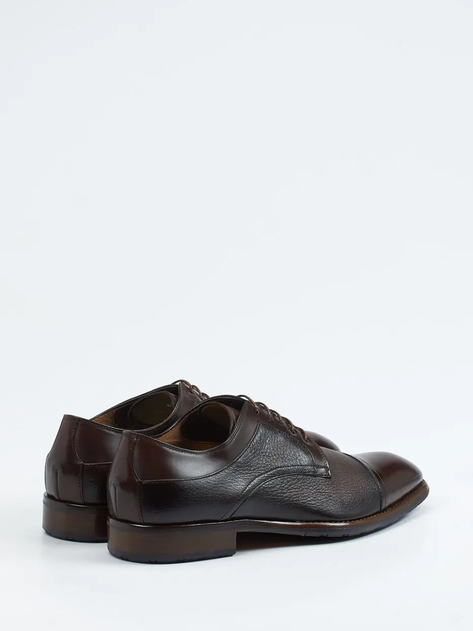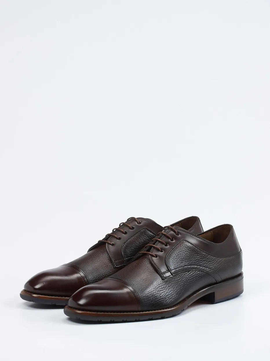 Ein klassischer Captoe-Derbyschuh in Dunkelbraun, der durch seine edle Materialkombination und fein profilierte Sohle markante Eleganz mit Alltagstauglichkeit verbindet.