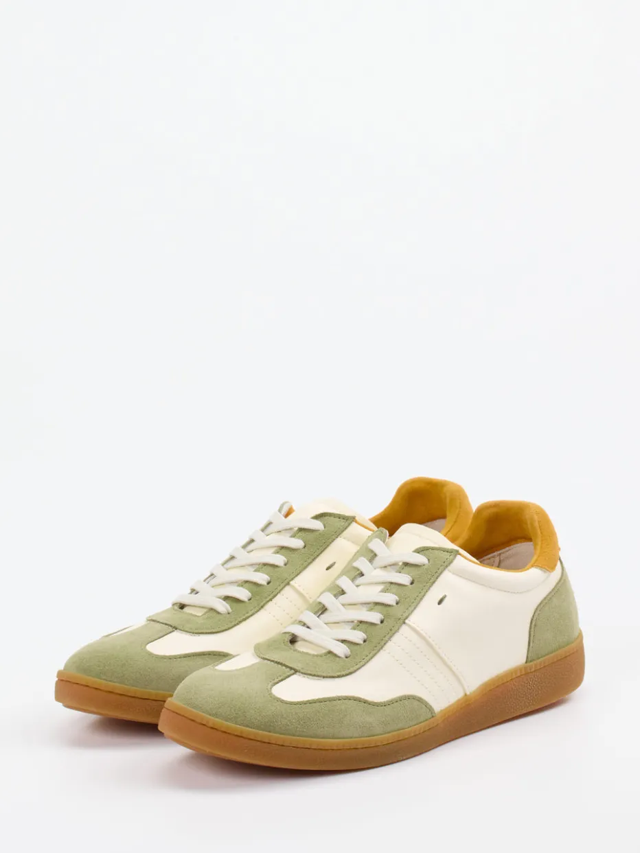 Urbaner Rückblick auf die 90er.Ralph Harrison Edition präsentiert mit diesem Sneaker ein Modell, das modischen Anspruch mit Alltagstauglichkeit verbindet. Ideal für entspannte Tage in der Stadt oder den Sommerurlaub überzeugt der Retro-Sneaker durch eine harmonische Farbwelt aus cremeweißem Kalbleder, salbeigrünen Veloursleder-Einsätzen und einem senfgelben Innenfutter. Der klassische, flache Schnitt wird durch eine Ton-in-Ton-Schnürung, eine verstärkte Ferse und eine griffig strukturierte Gummisohle ergänzt. Mit Elementen aus der Streetwear und Vintage-Ästhetik der 90er passt er perfekt zu Chinos oder leichten Stoffhosen. Ein modisches Statement mit Komfort-Finish – ganz im Stil von Ralph Harrison Edition.
