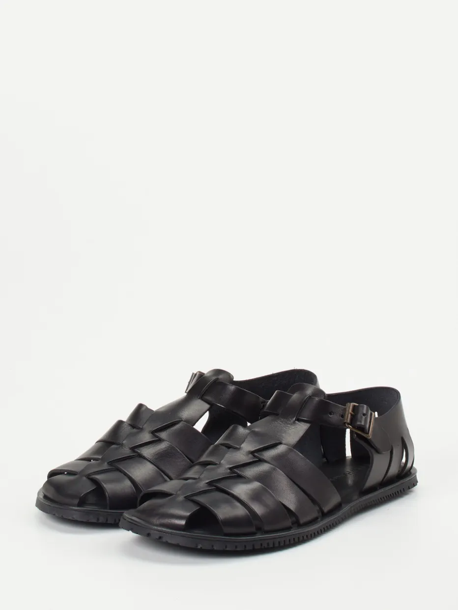 Maskuliner Sommerklassiker im Retro-Stil.Ralph Harrison interpretiert die klassische Herren-Fischersandale neu. Robustes, matt schwarzes Kalbleder prägt das geschlossene Design mit luftigen Durchbrüchen und geschlitztem Fersenbereich. Eine messingfarbene Metallschnalle bietet individuelle Weitenanpassung, während das gepolsterte Lederfußbett und die rutschfeste Gummisohle für hohen Alltagskomfort sorgen. Die Silhouette orientiert sich am minimalistischen Vintage-Look der 90er und trägt dezente Quiet-Luxury-Züge. Ideal zu Leinenhose oder Kurzarmhemd. Zeitlose Formgebung trifft auf komfortorientierte Verarbeitung – typisch Ralph Harrison.