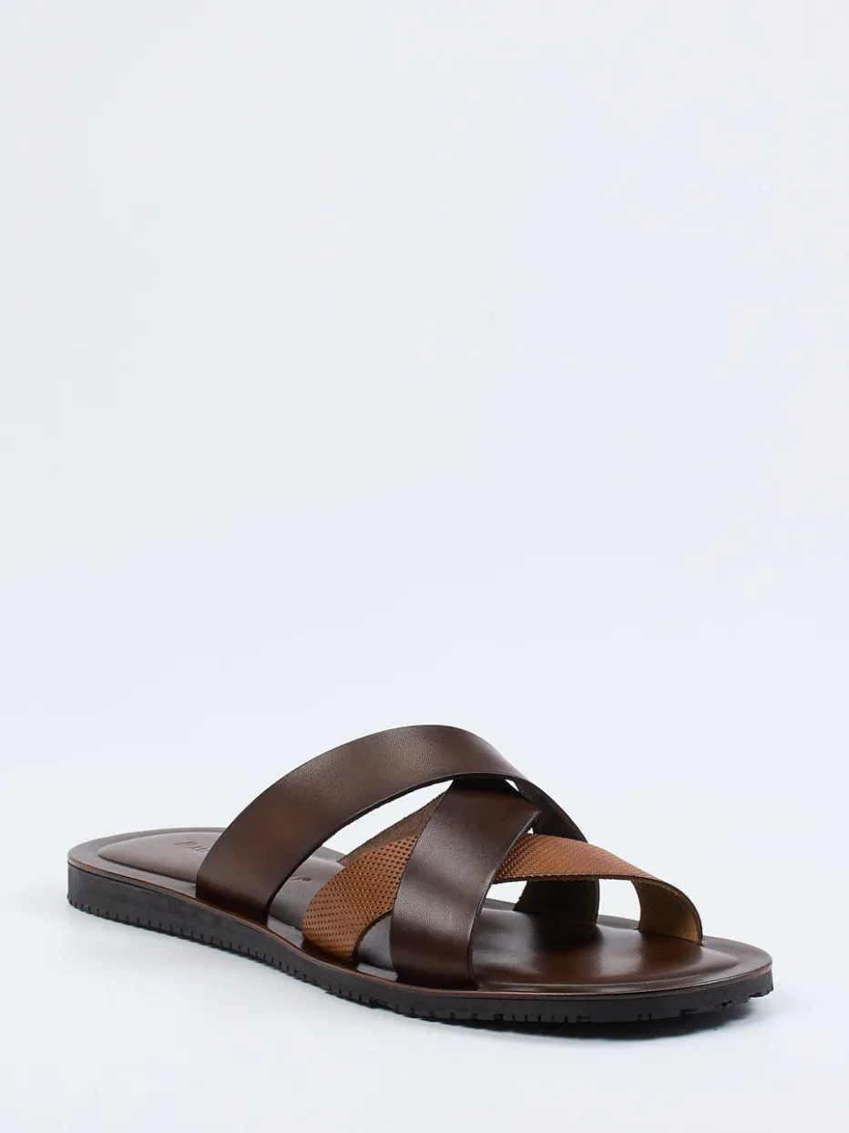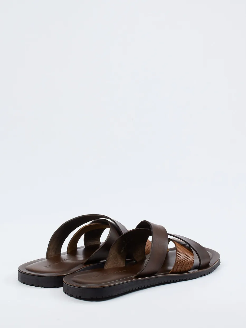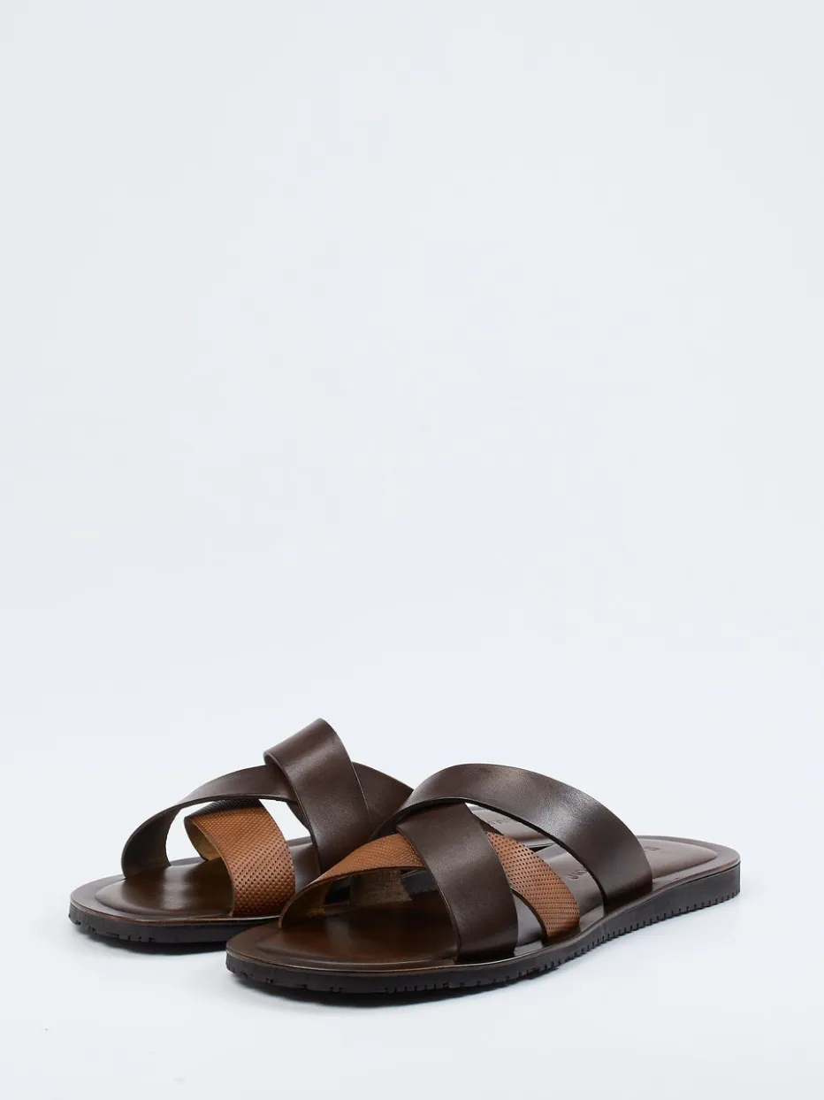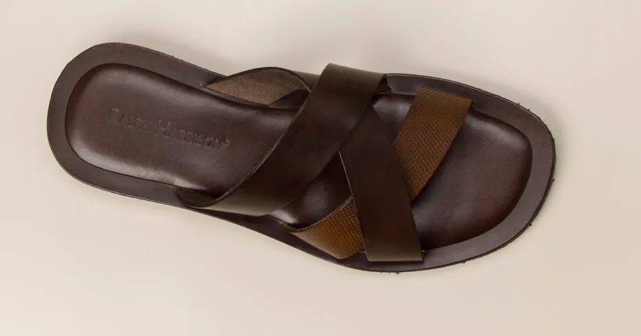 Stilsicher durch den Sommer.Ralph Harrison präsentiert mit dieser Pantolette ein Herrenmodell, das Funktionalität und Understatement vereint. Ideal für Freizeit und Urlaub, bietet das Modell mit seinen gekreuzten, teils perforierten Riemen aus samtig-mattem Kalbleder in Dunkelbraun und Cognac einen dezenten Look ganz im Zeichen des Quiet Luxury. Die flache Silhouette mit profilierter Gummisohle sorgt für Halt und Tragekomfort – auch bei längeren Wegen. Optisch ist die Pantolette reduziert und dennoch markant, unterstützt durch Ton-in-Ton-Optik und klare Linienführung. Perfekt zu Leinenhose und Kurzarmhemd kombinierbar. Bequemer Stil auf hohem Niveau – designed für entspannte Sommertage.