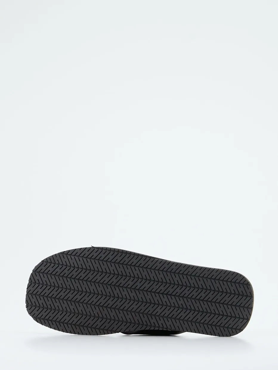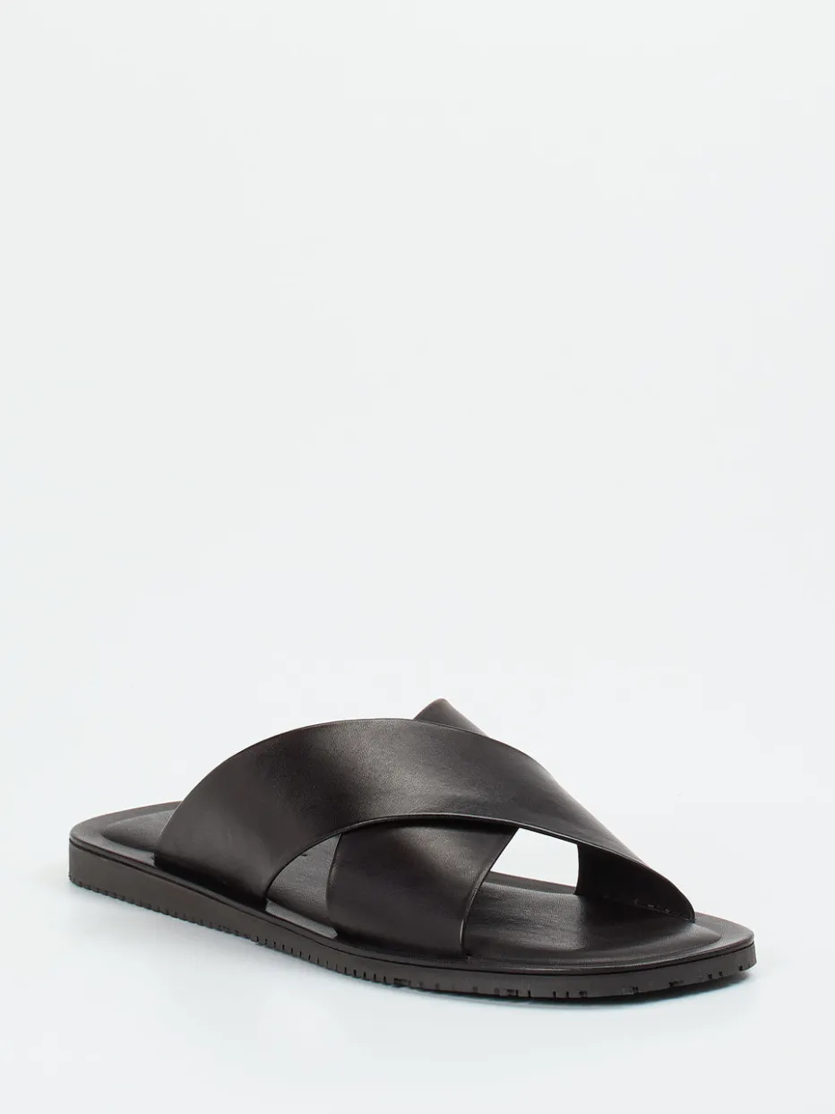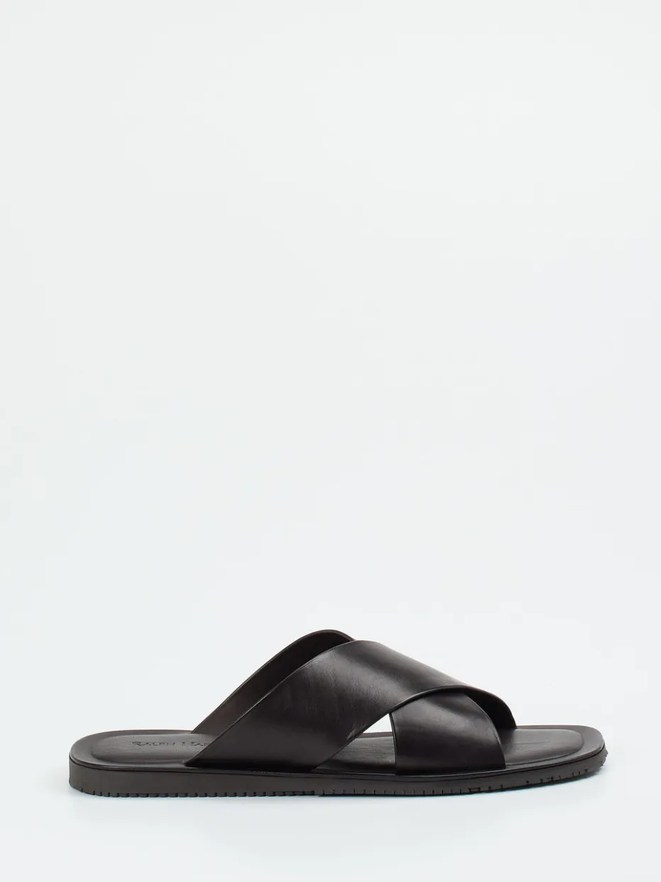 Moderne Klarheit für warme Tage.Ralph Harrison interpretiert bei dieser Herren-Pantolette den Klassiker neu. Die breiten, gekreuzten Riemen aus tief schwarzbraunem Kalbleder zeigen eine matt-samtige Oberfläche und unterstreichen das klare Design mit Ton-in-Ton-Nähten. Dank anatomisch geformtem, lederüberzogenem Fußbett bietet das Modell hohen Tragekomfort. Die profilierte Gummisohle sorgt für Rutschfestigkeit – ideal für Alltag und Sommerurlaub. Der urbane Quiet-Luxury-Look passt besonders gut zu Leinen-Shorts und cleanen Poloshirts. Ein Essential für minimalistische Ästhetik mit komfortorientierter Raffinesse.