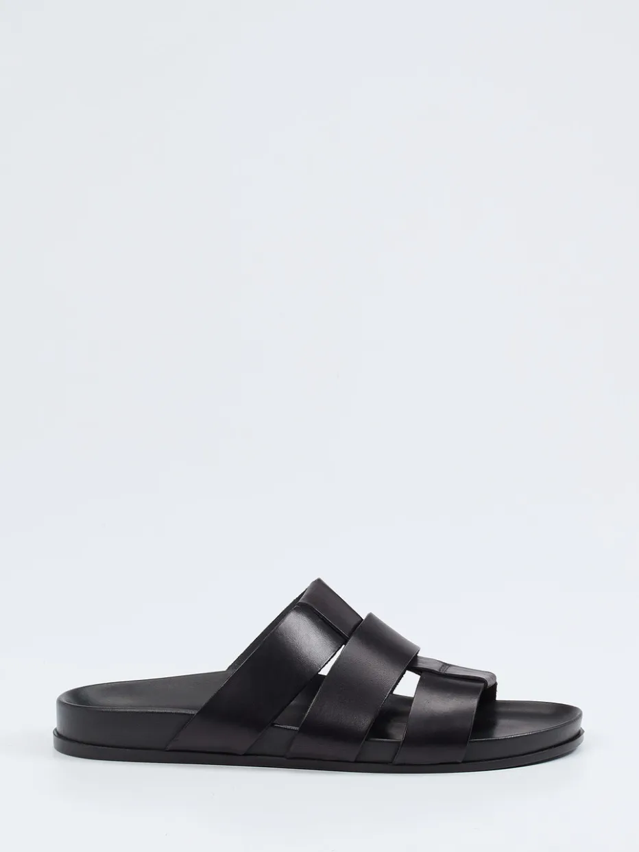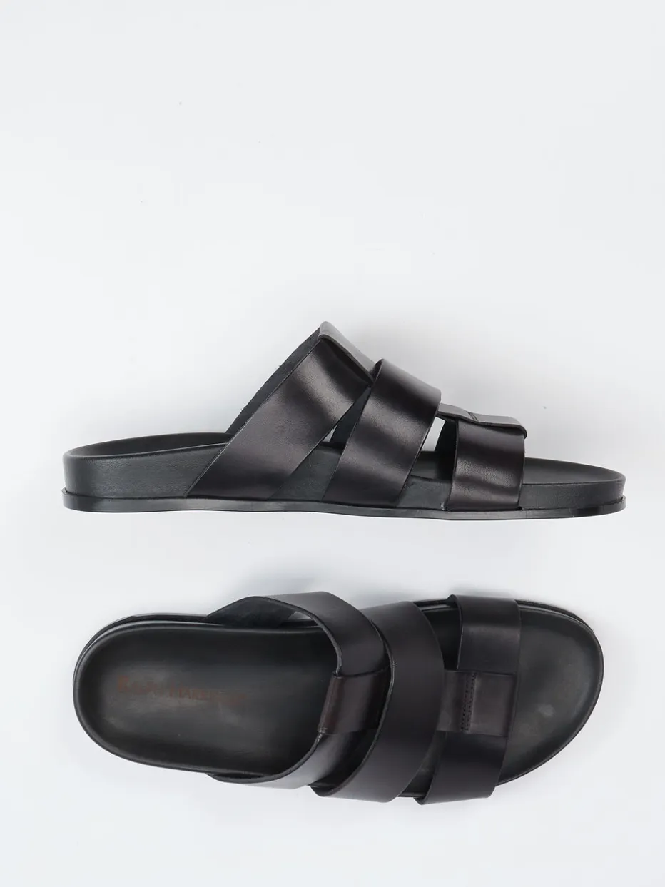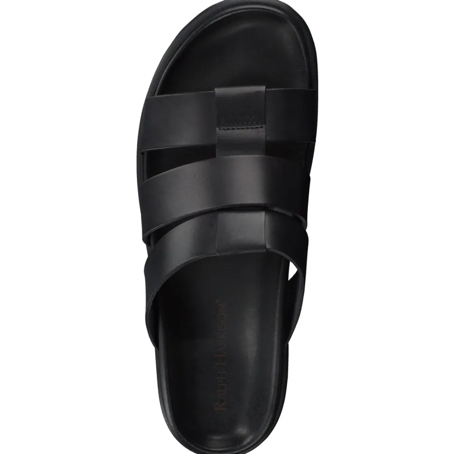 Klarer Stil für warme Tage.Ralph Harrison präsentiert eine puristische Herren-Sandale in der Kategorie Slides. Ideal bei sommerlichen Temperaturen bietet sie dank gepolsterter Innensohle und anatomisch geformtem Fußbett spürbaren Komfort. Gefertigt aus schwarzem Kalbleder mit mattierter Optik und überkreuzten Riemen überzeugt sie durch reduziertes Design und zurückhaltende Ton-in-Ton-Nähte. Die offene Form und die rutschhemmende Gummisohle komplettieren den lässigen Look. Inspiriert vom Quiet-Luxury-Trend ergänzt sie mühelos urbane Freizeitgarderoben. Besonders geeignet für minimalistische Outfits mit Leinen-Shorts oder Poloshirts. Kombiniert zeitlose Maskulinität mit hochwertiger Verarbeitung in klarer Linienführung.