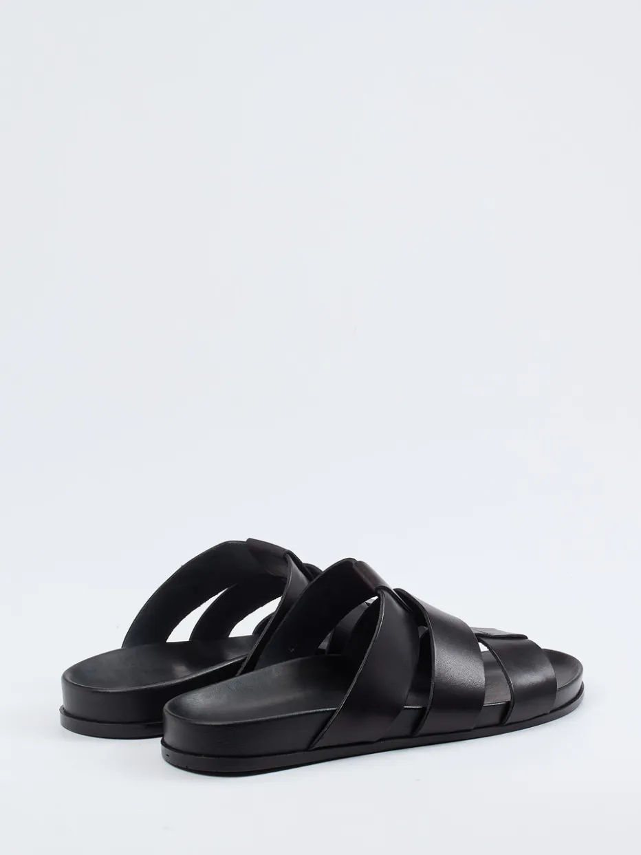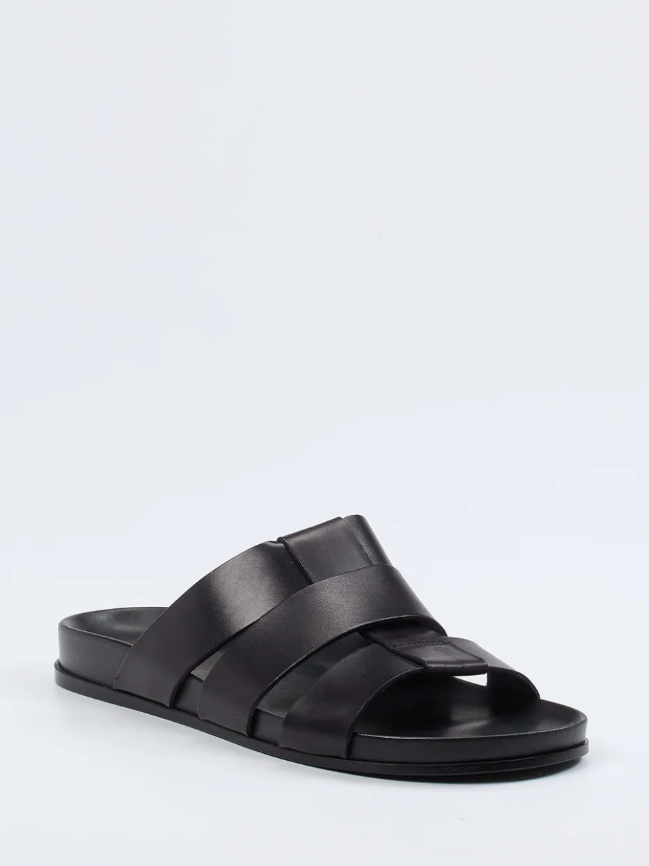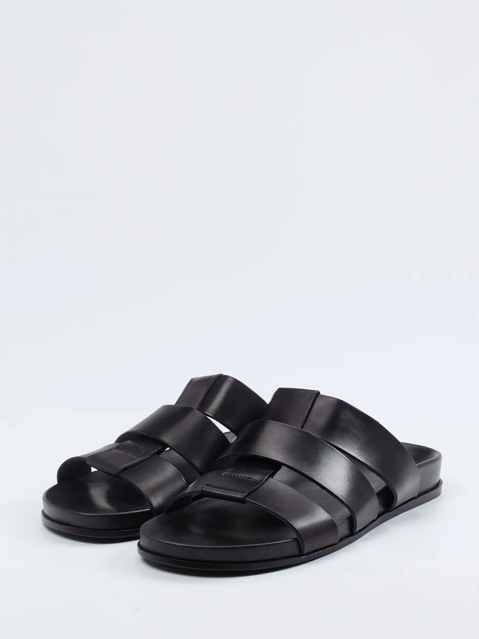Klarer Stil für warme Tage.Ralph Harrison präsentiert eine puristische Herren-Sandale in der Kategorie Slides. Ideal bei sommerlichen Temperaturen bietet sie dank gepolsterter Innensohle und anatomisch geformtem Fußbett spürbaren Komfort. Gefertigt aus schwarzem Kalbleder mit mattierter Optik und überkreuzten Riemen überzeugt sie durch reduziertes Design und zurückhaltende Ton-in-Ton-Nähte. Die offene Form und die rutschhemmende Gummisohle komplettieren den lässigen Look. Inspiriert vom Quiet-Luxury-Trend ergänzt sie mühelos urbane Freizeitgarderoben. Besonders geeignet für minimalistische Outfits mit Leinen-Shorts oder Poloshirts. Kombiniert zeitlose Maskulinität mit hochwertiger Verarbeitung in klarer Linienführung.