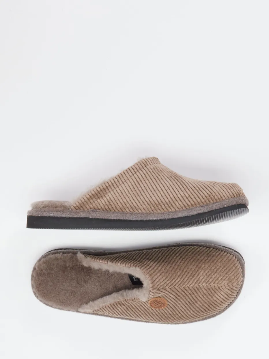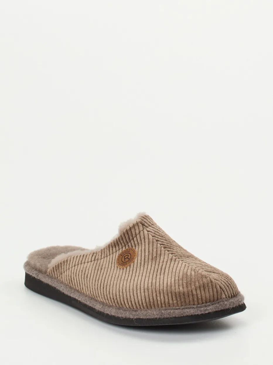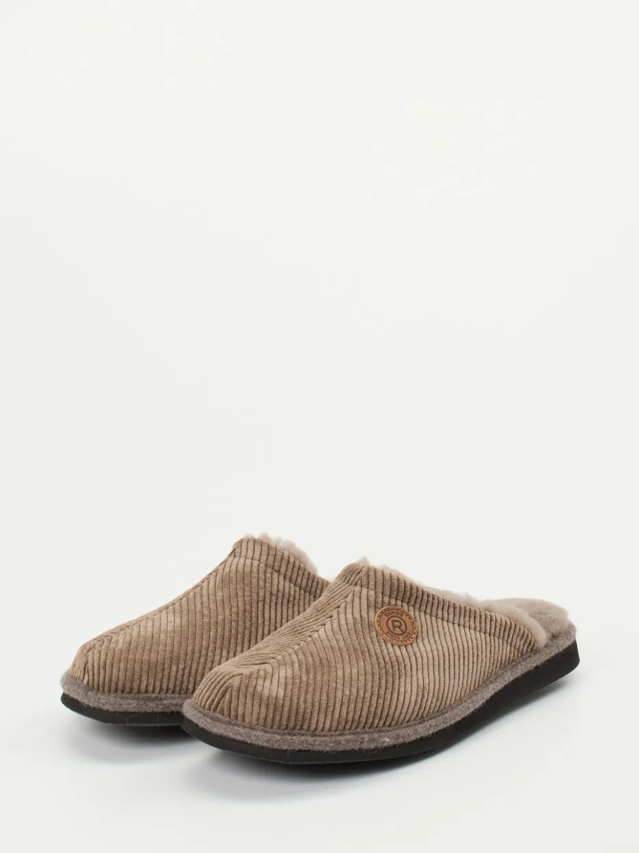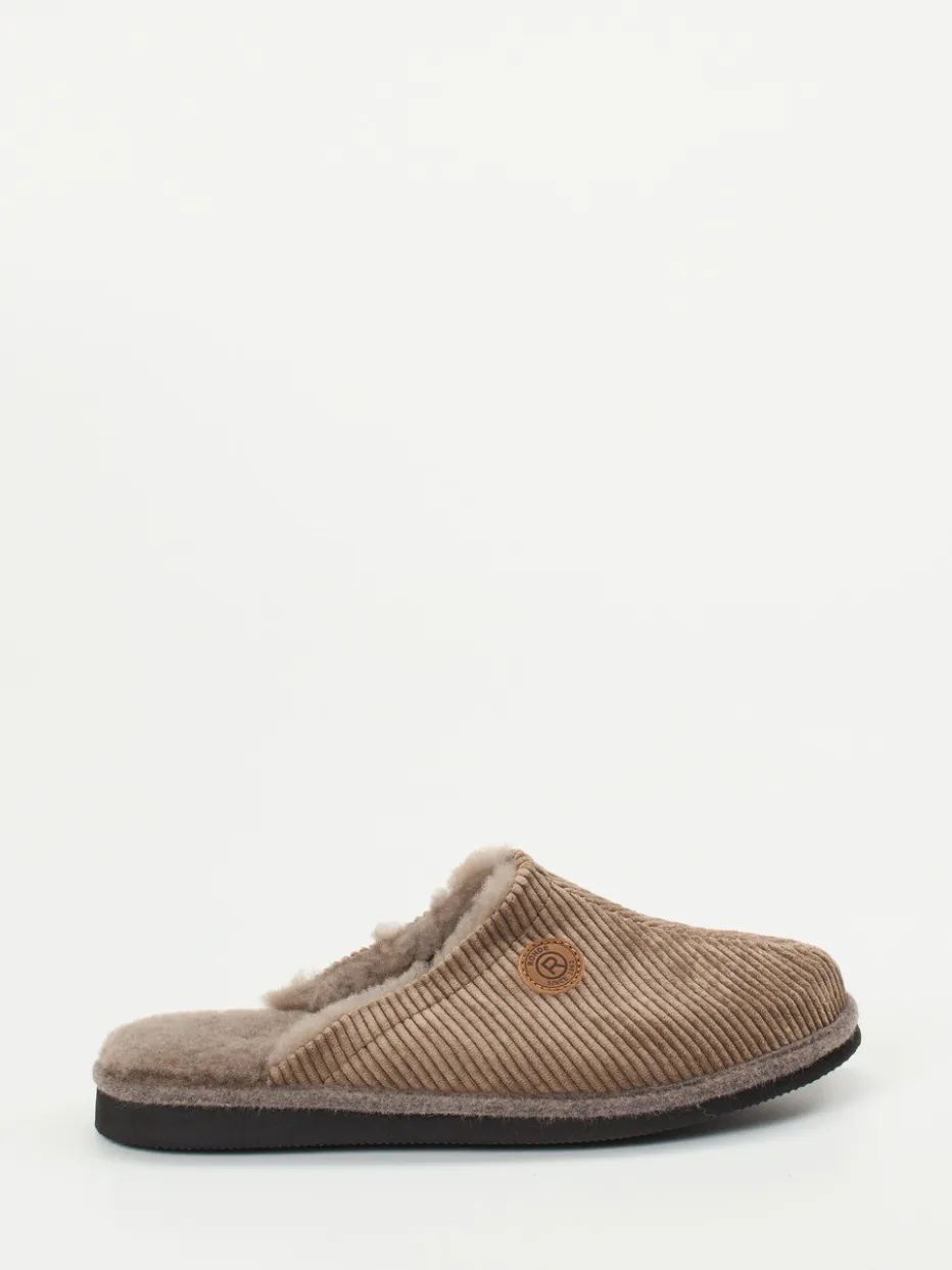 Die komfortablen Rohde-Hausschuhe kombinieren gerippten Cord in Taupe mit softem Lammfellfutter – ideal für entspannte Momente mit stilvoller Loungewear-Note.