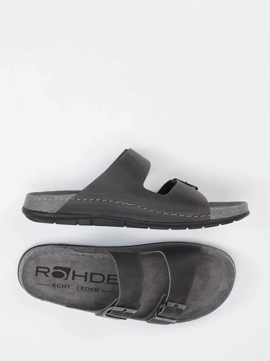 Relaxed Style mit funktionalem Kern.Rohde präsentiert eine komfortorientierte Zweiriemer-Pantolette für Herren. Ideal für entspannte Sommertage zu Hause oder in der Freizeit: Das robuste Nubukleder, samtig angeschliffen, harmoniert in grauer Farbgebung mit der schlichten Silhouette. Zwei silberfarbene Metallschnallen ermöglichen eine individuell einstellbare Passform, während die weich gepolsterte Veloursleder-Innensohle und das ergonomische Fußbett höchsten Tragekomfort gewährleisten. Die profilierte Gummisohle mit Dämpfungselement sorgt für Trittsicherheit. Minimalistisch im Design, passt sie zu Leinen-Bermudas und Naturtönen. Zeitlose Kombination aus Komfort, Qualität und klarer Formensprache.