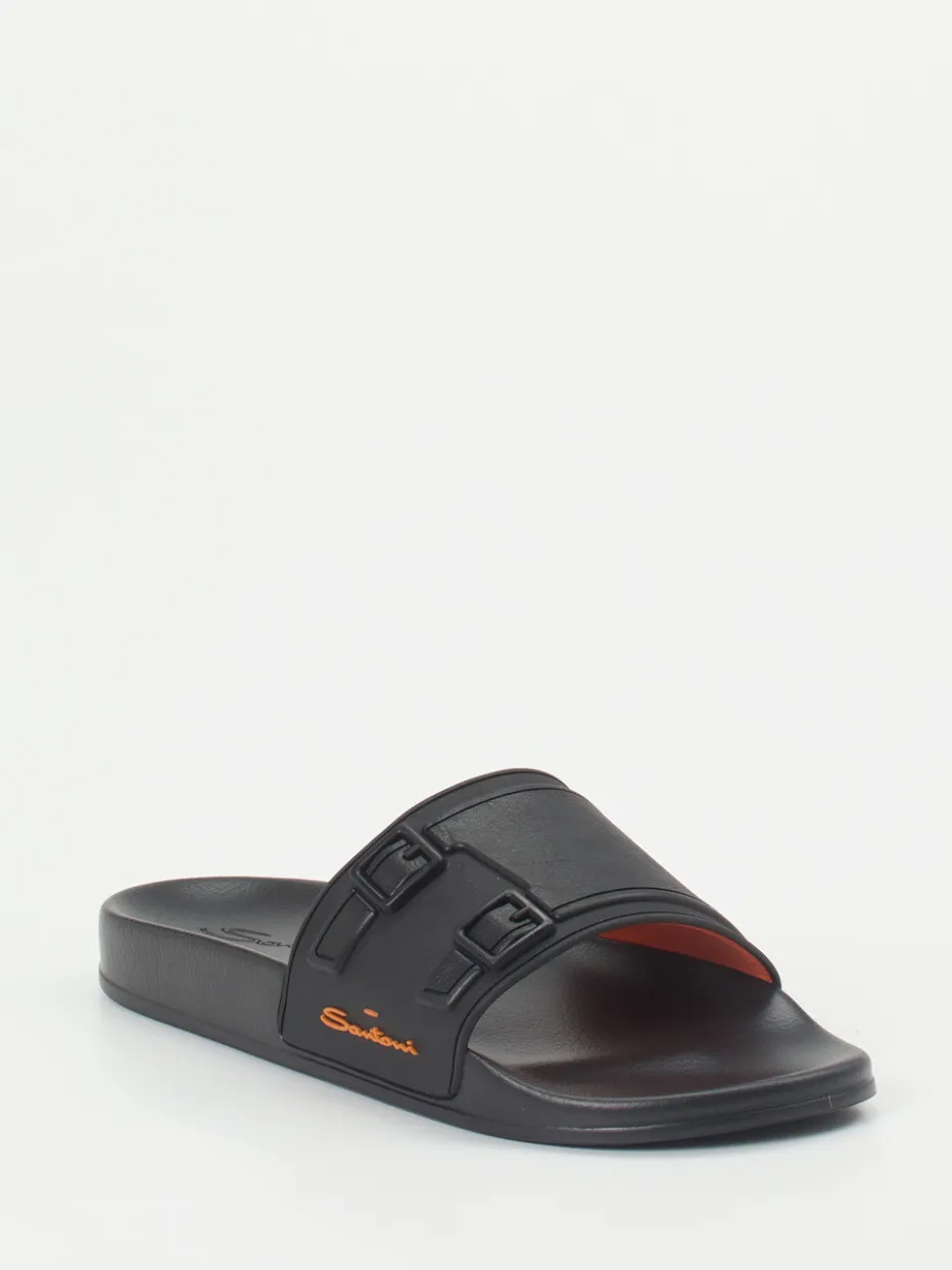 Sommer trifft Statement.Die Marke Santoni präsentiert mit dieser Herren-Pantolette ein modernes Slide-Modell für Freizeit und Strand. Ideal für entspannte Tage am Pool oder auf Reisen: Gefertigt aus hochwertigem Gummi mit matter Oberfläche zeigen sich die Badeslipper in sattem Schwarz. Die breite Riemenbandage ist mit tonalen Schnallendetails versehen, das auffällige orangefarbene Markenlogo und das kontrastfarbene Innenfutter setzen dynamische Akzente. Das geprägte Fußbett und die flache Gummisohle sorgen für Komfort bei jedem Schritt. Inspiriert vom Streetwear-Trend „Quiet Luxury“ lässt sich das Modell vielseitig kombinieren – etwa zu Badehose oder loungigem Outfit. Stilvoller Alltagsbegleiter mit klarer Designhandschrift von Santoni.