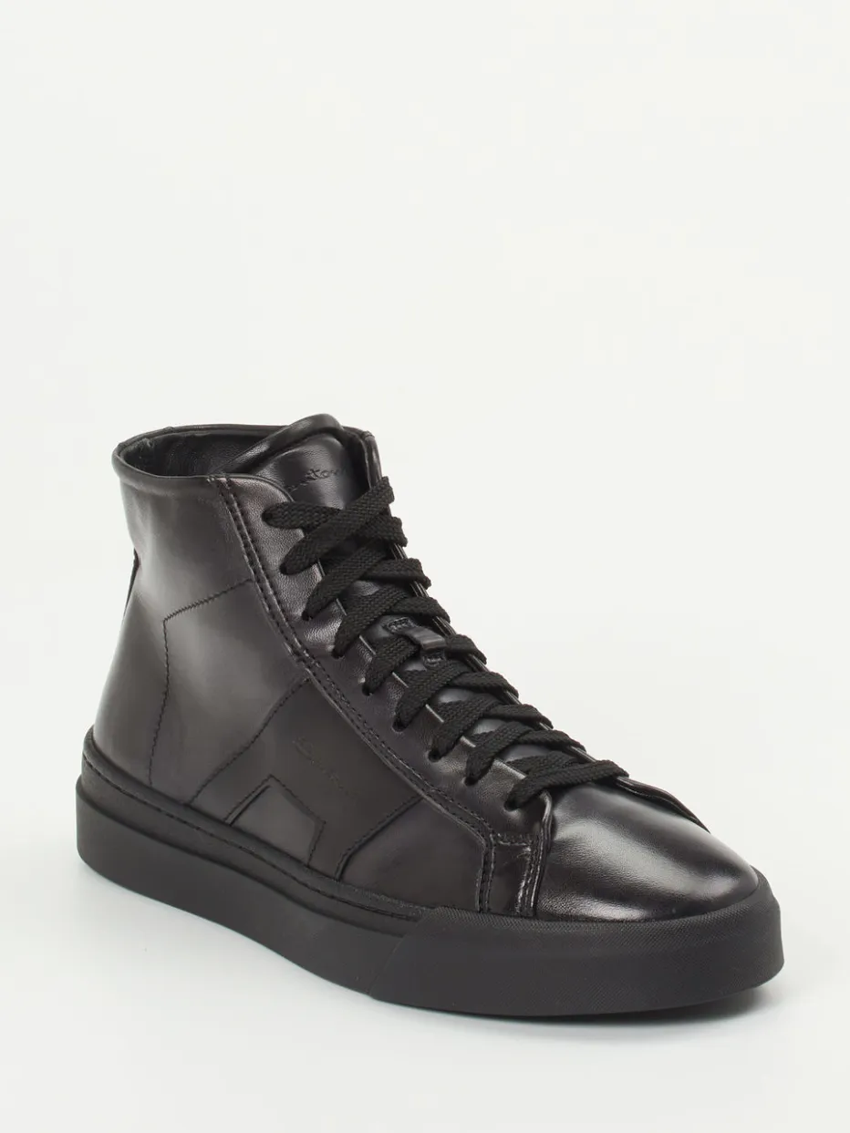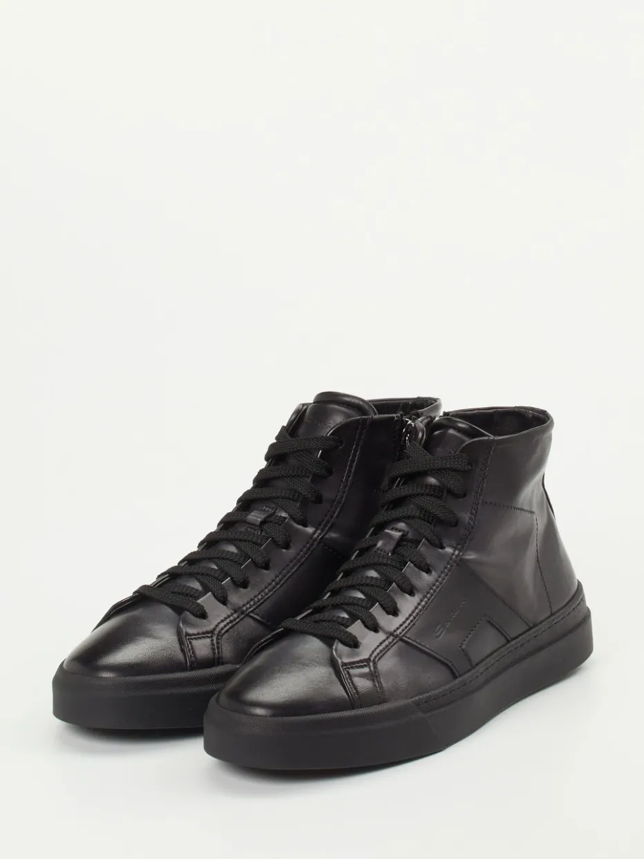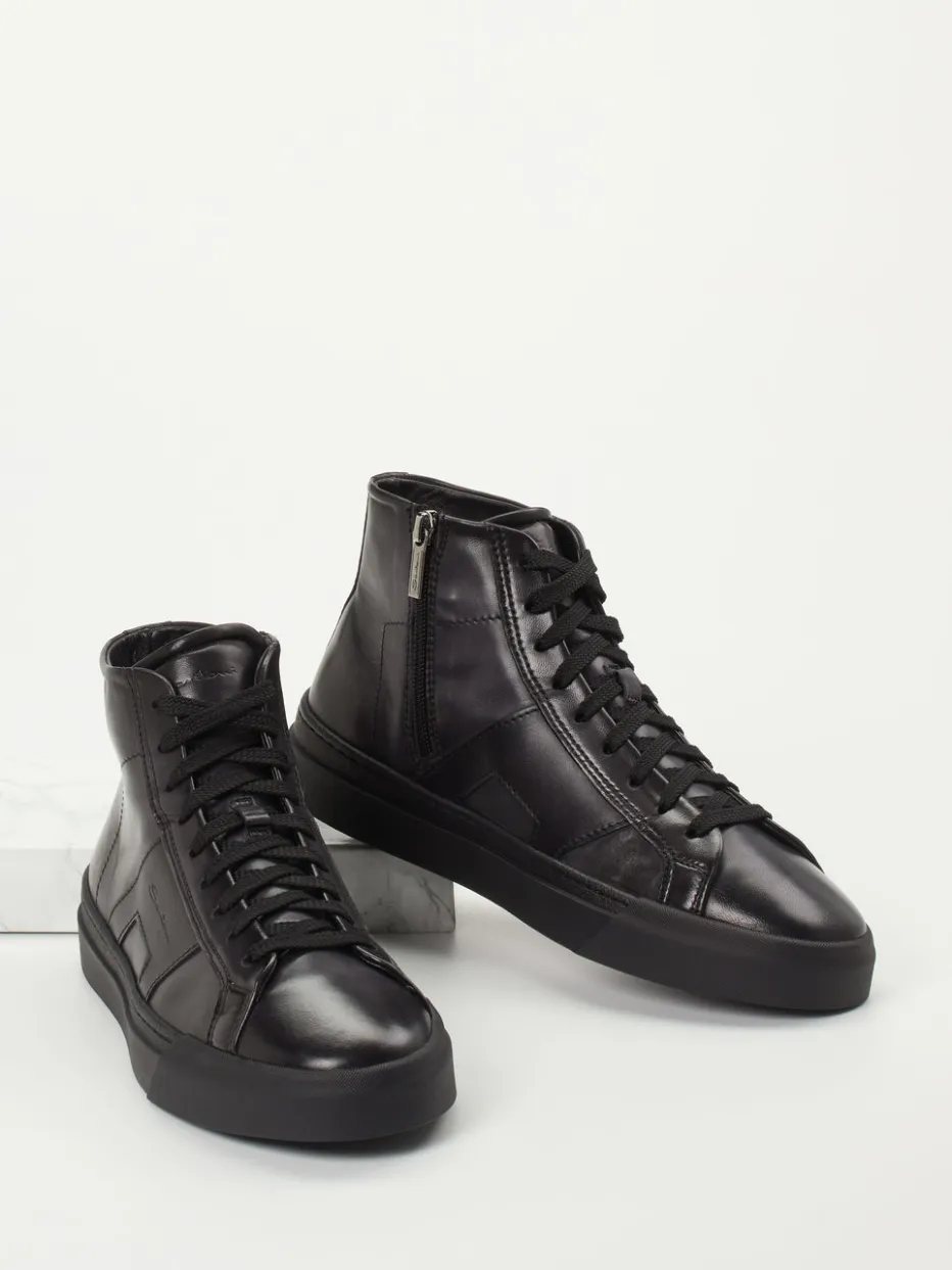 Minimalistischer Streetstyle in edler Ausführung.Santoni bietet mit diesem High-Top-Sneaker ein maskulines Modell mit urbanem Anspruch. Gefertigt aus hochwertigem Kalbleder mit glänzender Oberfläche vereint er handwerkliche Qualität mit moderner Eleganz. Die schwarze Farbe und die hochgeschlossene Silhouette verleihen dem Auftritt Geradlinigkeit und Präsenz. Schnürung und seitlicher Innenreißverschluss sorgen für individuellen Halt und einfaches Anziehen. Die flexible Gummisohle trägt zur angenehmen Alltagstauglichkeit bei. Ideal für minimalistische Looks im „Quiet Luxury“-Trend – kombinierbar mit dunklem Denim oder Business-Casual-Outfits. Markentypische Qualität, die Understatement mit exzellenter Verarbeitung verbindet.