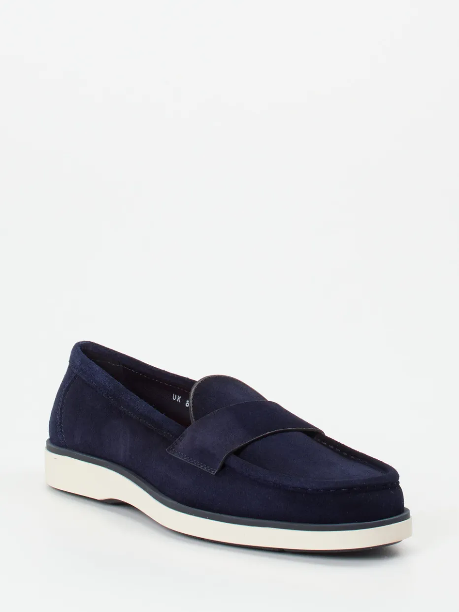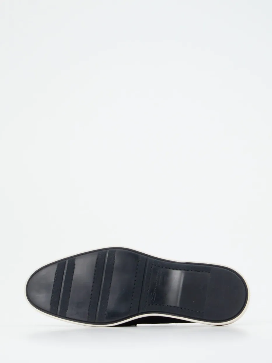 Sportlich-eleganter Klassiker fürs Büro.Santoni präsentiert mit diesem Herren-Loafer ein Modell der gehobenen Casualwear. Für entspannte Geschäftstermine oder gehobene Freizeitlooks bietet dieser marineblaue Slipper Komfort und Stil zugleich. Das fein gearbeitete Veloursleder überzeugt durch seine matte Oberfläche und angenehme Haptik. Die klassische, flache Silhouette wird durch eine weiße Gummisohle mit dunklem Akzent sportlich ergänzt. Das mit Kalbleder ausgekleidete Innere und das gepolsterte Fußbett sorgen für angenehmen Tragekomfort. Inspiriert vom Preppy-Stil ist der Schlupfschuh auch modisch im Trend „Quiet Luxury“ zuhause. Perfekt zur beigen Chino und sommerlichem Sakko. Santoni steht für anspruchsvolle Handwerkskunst mit stilvoller Leichtigkeit.