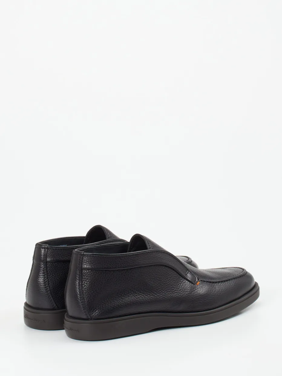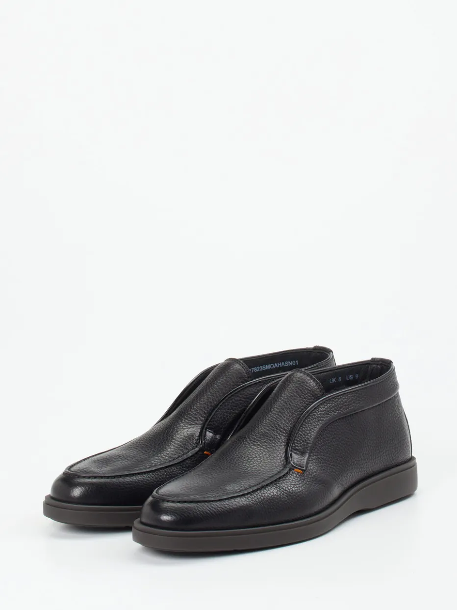 Italienischer Komfort trifft zurückhaltende Eleganz.Die Luxusmarke Santoni präsentiert mit diesem Herren-Mid-Cut-Slipper ein stilvolles Modell für Alltag und Business-Casual. An kalten Tagen bietet der Schuh durch sein wärmendes Lammfellfutter und die weiche Verarbeitung aus genarbtem Hirschleder ein exzellentes Tragegefühl. In Schwarz gehalten, mit klarer Silhouette, Zuglasche innen und dezenter orangener Kontrastnaht, wirkt das Modell puristisch und hochwertig zugleich. Die profilierte Gummisohle ist rutschhemmend und optisch zurückgenommen. Minimalistische Linienführung und „Quiet Luxury“-Charakter lassen sich vielseitig kombinieren – etwa mit Wollhose und Lederaccessoire. Ein handwerklicher Klassiker mit modernem Anspruch und exzellenter Verarbeitung.