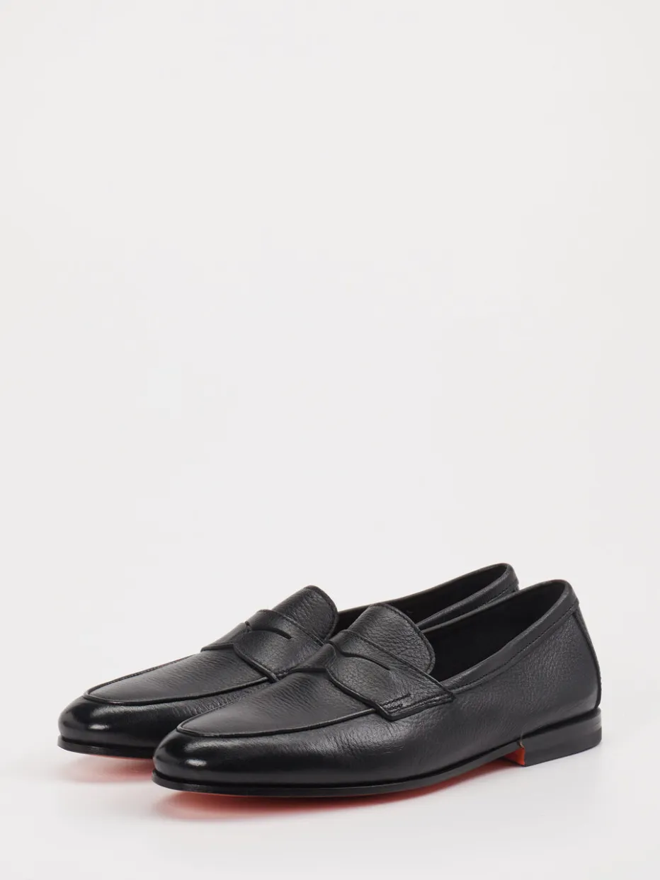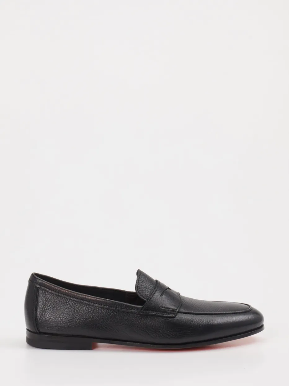 Charakterstarker Klassiker mit italienischem Twist. Santoni präsentiert einen Herren-Penny-Loafer aus hochwertigem Kalbleder. Ideal für anspruchsvolle Office-Looks oder elegante Freizeitoutfits – dieser schwarze Slipper überzeugt mit genarbter Lederoberfläche, schlanker Silhouette und einem flachen, durchgehenden Absatz. Das Innenfutter aus Leder sorgt für angenehmen Tragekomfort, während die orangefarbene Ledersohle mit Signature-Charakter ein dezentes Statement setzt. Minimalistische Details wie die Zunge mit Penny-Slot und Ton-in-Ton-Nähte runden das puristische Design stilvoll ab. Als echtes Quiet-Luxury-Piece harmoniert er besonders gut zu dunklen Anzügen oder schmal geschnittenen Chinos. Ein italienischer Klassiker, handwerklich präzise umgesetzt mit eleganter Substanz.