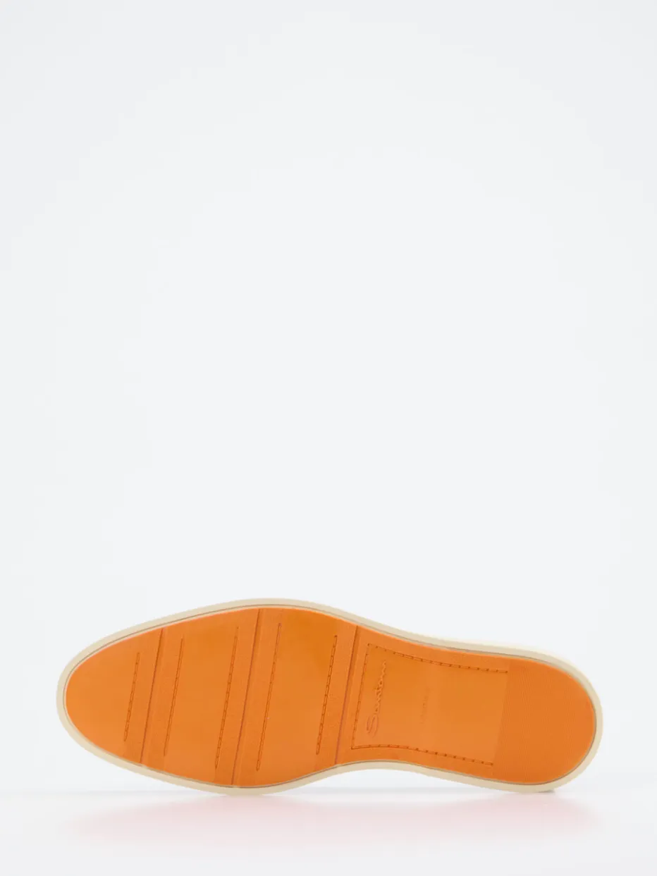 Komfort trifft unaufgeregten Stil. Santoni präsentiert mit diesem Herren-Slipper einen klassischen Penny Loafer für stilbewusste Alltags- und Business-Looks. Ideal für urbane Alltagsszenarien bietet das Modell hochwertiges Veloursleder mit matter Oberfläche und eine rutschfeste Gummisohle. Der taubenblaue Farbton trifft auf präzise Ton-in-Ton-Nähte und ein Kontrastfutter in leuchtendem Orange. Typische Details wie der Penny-Riegel und eine minimalistische Form prägen die klare Designsprache. Der Schuh betont ein leises Luxusverständnis im Sinne moderner Soft-Tones-Ästhetik. Ein stilvoller Allrounder mit italienischem Understatement und funktionalem Tragekomfort.