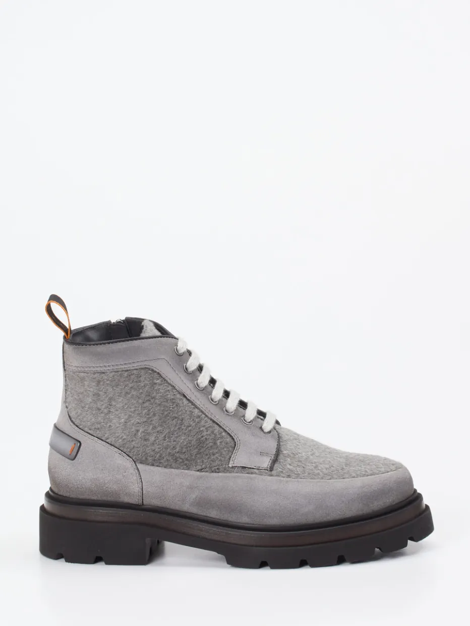 Stilvoller Begleiter mit urbanem Charakter.Santoni präsentiert diese luxuriösen Herren-Schnürboots aus feinem Veloursleder. Für kalte Tage in der Stadt oder längere Outdoor-Spaziergänge bieten diese knöchelhohen Boots mit Lammfellfutter angenehme Wärme und Tragekomfort. Das samtig genarbte, hellgraue Leder präsentiert sich im ausgewogenen Materialmix mit optisch markantem Filztextil. Der seitliche Reißverschluss ergänzt die Schnürung funktional und erleichtert den Einstieg. Die schwarze Gummisohle mit Profil sowie umlaufendem Rahmen in Holzoptik sorgt für sicheren Grip und Designtiefgang mit Utility-Charakter. Perfekt zu Wollmütze und Parka in gedeckten Tönen kombinierbar. Handwerkskunst von Santoni mit alltagstauglichem Komfort und progressivem Winterstyle.