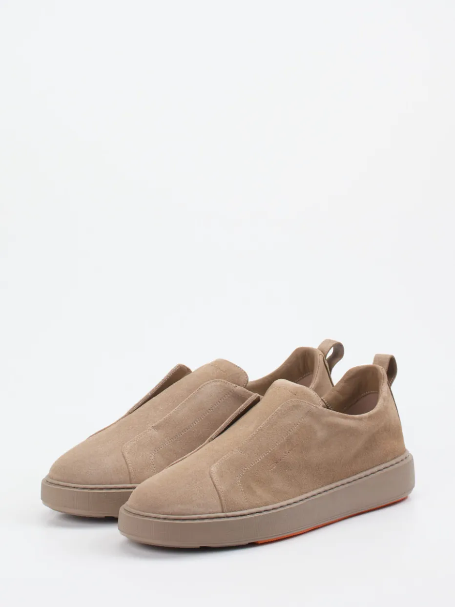 Stilvoller Komfort in Sandbeige.Santoni zeigt mit diesem Slip-On Sneaker gekonnt, wie luxuriöser Minimalismus funktioniert. Ob für urbane Relax-Looks oder stilvolle Loungewear – dieser flach geschnittene Herrensneaker aus hochwertigem Veloursleder, samtig angeschliffen, passt sich jeder Situation an. Die Komfort-Passform wird durch elastische Einsätze und ein gepolstertes Kalblederfutter unterstützt. Der sandbeige Grundton harmoniert mit tonigen Nähten, während die orangefarbene Gummilaufsohle für stilistische Raffinesse sorgt. Die Zuglasche hinten und die rahmengenähte Schalensohle unterstreichen Lässigkeit und Handwerk gleichermaßen. Modische Einflüsse aus „Quiet Luxury“ und „Soft Neutrals“ machen ihn trendgerecht kombinierbar, etwa mit Chinohosen in ähnlichen Naturtönen. Santoni steht für italienische Handwerkskunst mit zeitlosem Designanspruch.