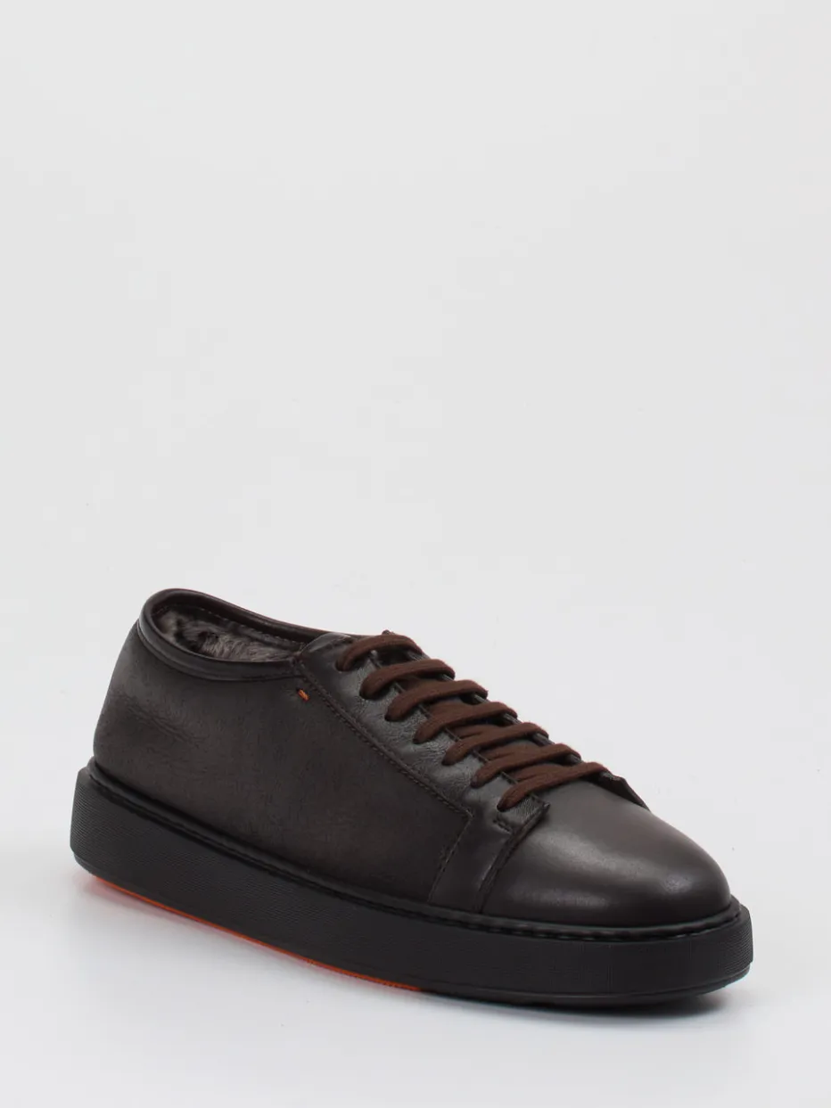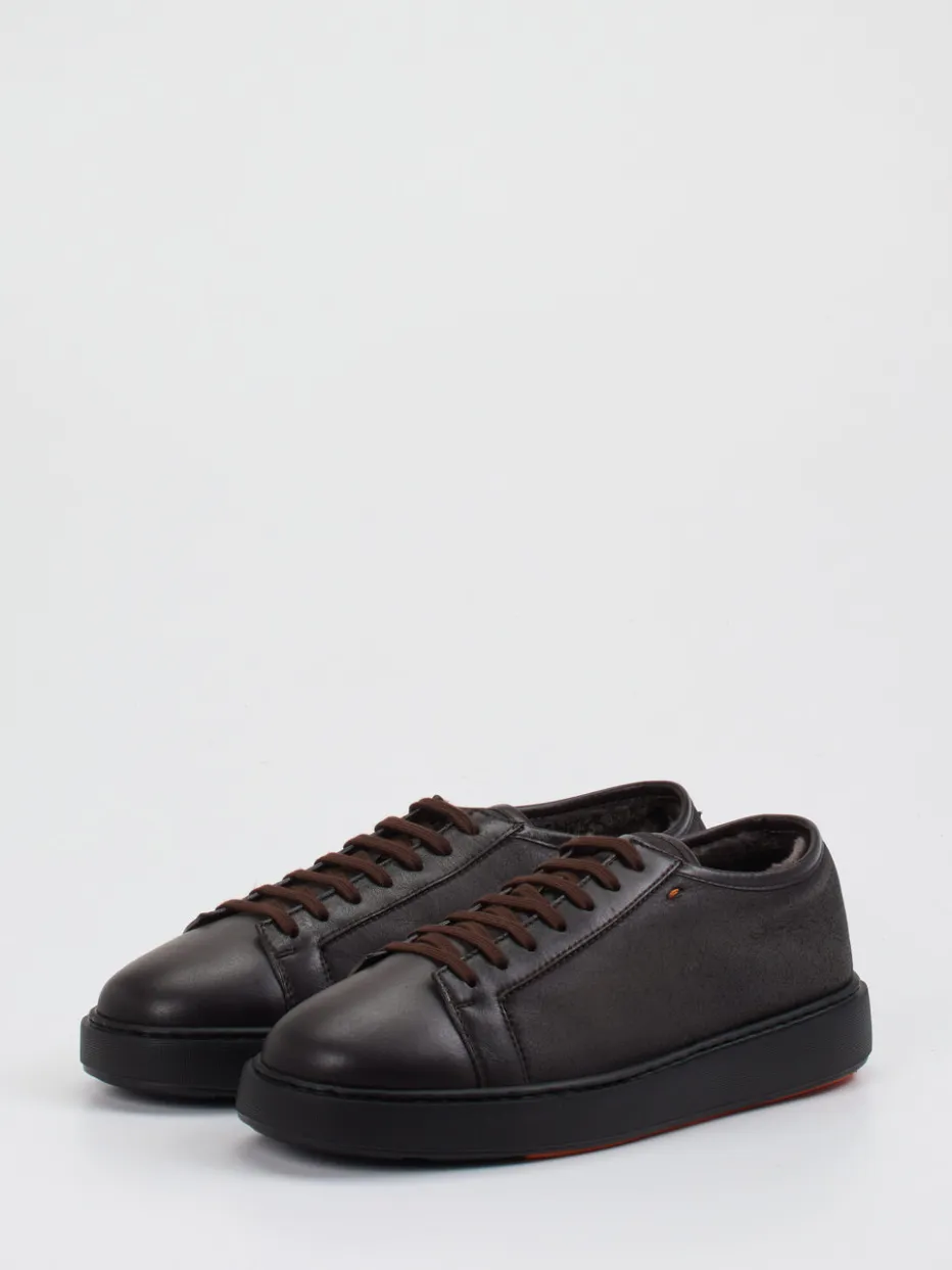 Eleganter Minimalismus trifft Komfort. Die Marke Santoni präsentiert mit diesem Sneaker einen klassisch designten Low-Top für Herren. Ob im urbanen Alltag oder im Büro mit Casual Dresscode – das Modell überzeugt durch dunkelbraunes Lammleder mit matter Oberfläche und eine harmonisch abgesetzte orangefarbene Gummisohle. Der rund gearbeitete Schaft, gepolsterte Rand und das Innenfutter aus Lammfell sorgen für Tragekomfort, auch an kühleren Tagen. Tonale Nähte unterstreichen den minimalistischen Look, während Schnürung und klare Silhouette dem Streetwear-Einfluss gerecht werden. Lässt sich vielseitig kombinieren – etwa mit Wollhose und Feinstrickpullover. Authentischer Stil mit luxuriöser Zurückhaltung – Santoni-typisch durchdacht.