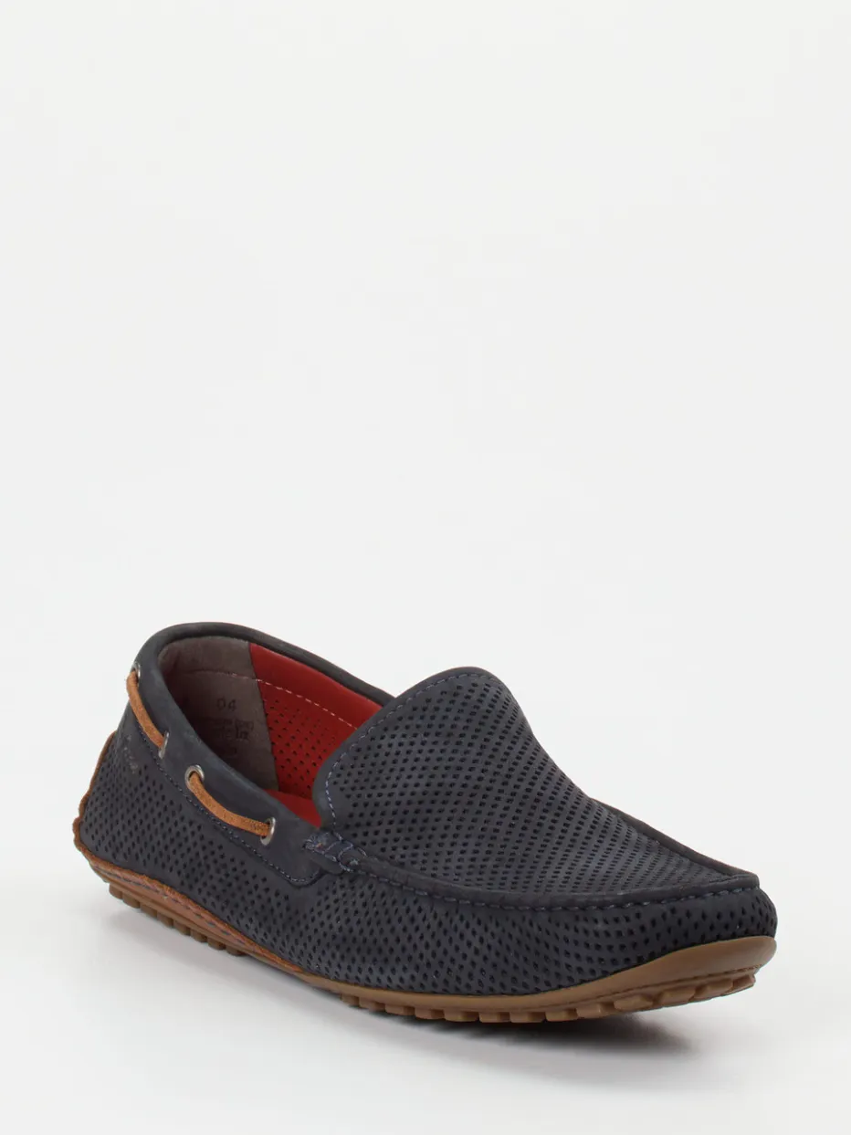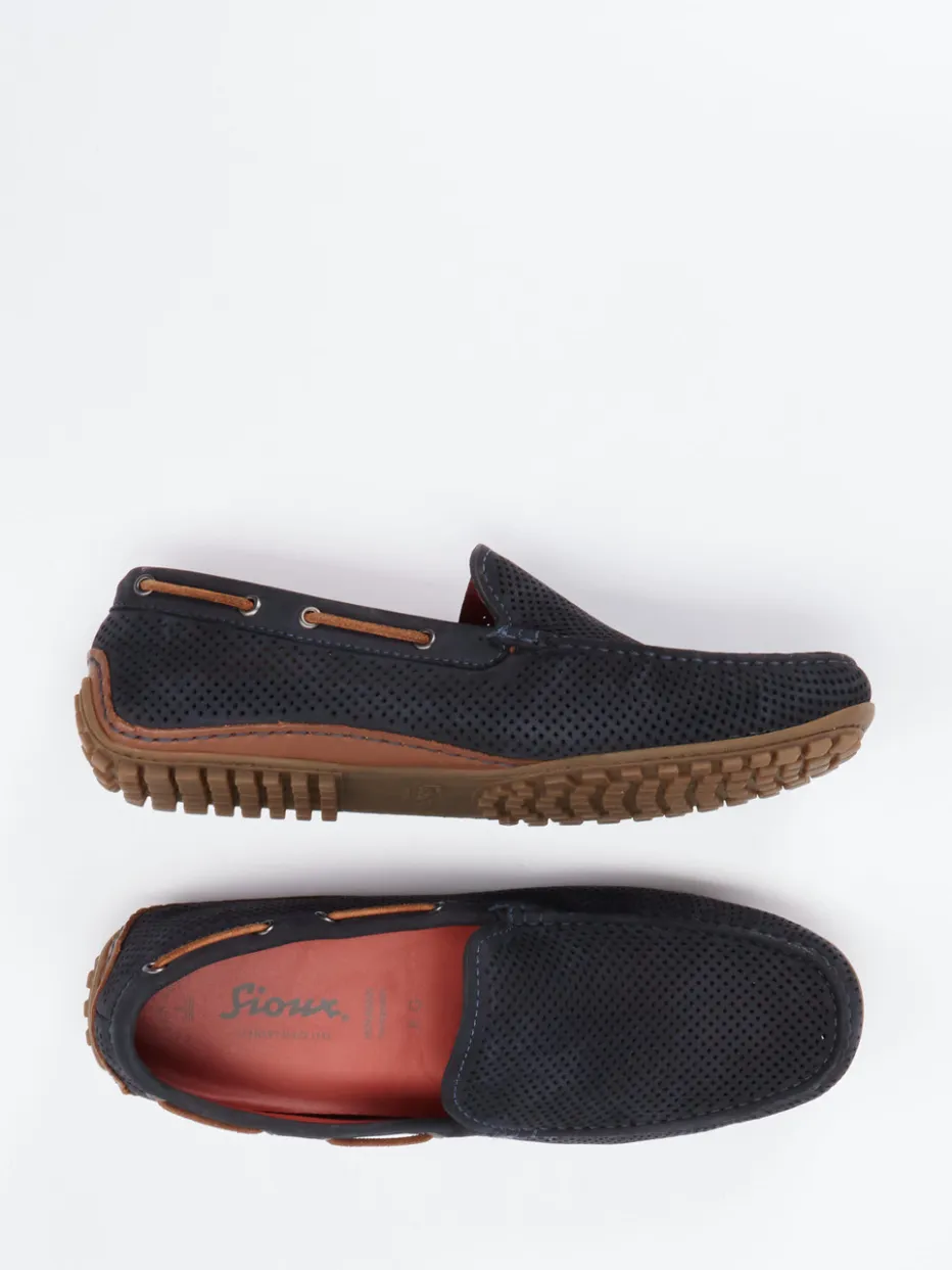 Aus geprägtem Veloursleder in Dunkelblau gefertigt und samtig-matt im Griff, bietet das Modell mit feiner Perforation optimale Atmungsaktivität. Die flache Silhouette mit seitlicher Zierbandführung, Kontrastnähten und sportlichem Lederband in Mittelbraun verleiht dem Look eine edel-lässige Note. Die flexible Gummisohle mit Noppenprofil sorgt für sicheren Halt, während das herausnehmbare, weich gepolsterte Fußbett höchsten Tragekomfort verspricht. Ideal zu Leinenhosen oder Poloshirts.