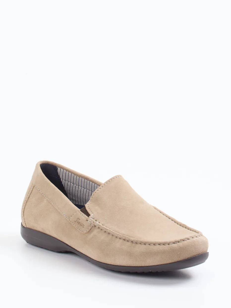 Schlichte Eleganz für Alltag und Büro.Der Herren-Mokassin von Sioux überzeugt mit zurückhaltendem Stil und angenehmem Komfort für urbane Casual- oder Business-Outfits. Perfekt für warme Tage im Büro oder entspannte Stadtausflüge: Das beigefarbene Veloursleder zeigt eine samtig-matte Oberfläche und wird durch Ton-in-Ton-Nähte sowie ein geprägtes Seitenlogo optisch veredelt. Klassisch flach geschnitten, bietet der Slipper mit elastischen Einsätzen bequemen Einstieg. Die schwarzbraune, profilierte Gummisohle sorgt für Leichtigkeit und Halt, das herausnehmbare Fußbett für angenehmes Klima. Inspiriert vom „Quiet Luxury“-Trend lässt sich das Modell bestens zu hellen Chinos und leichten Hemden kombinieren. Ein authentisches Komfortstatement im eleganten Casual-Stil von Sioux.