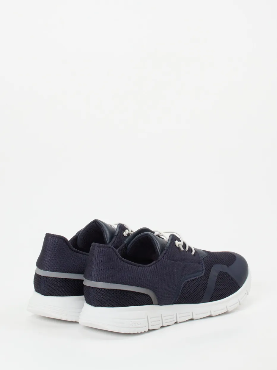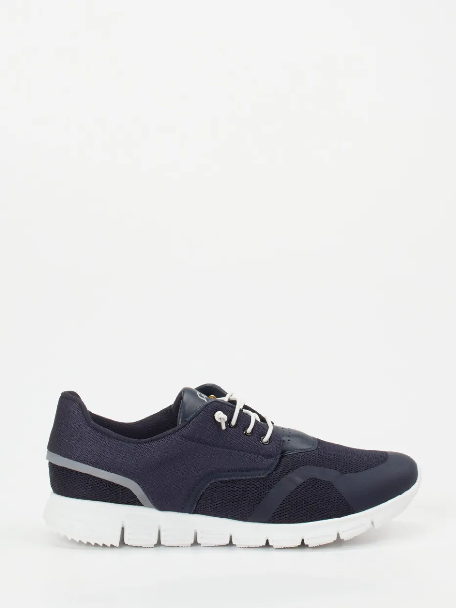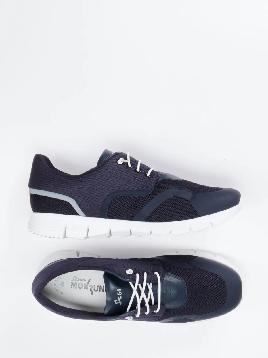 Technik trifft Leichtigkeit.Der Herren-Sneaker von Sioux vereint sportliches Design mit funktionalem Komfort. Für längere Ausflüge oder den aktiven Alltag bietet das luftdurchlässige Mesh-Textil mit mattem Finish eine spürbare Atmungsaktivität. Besonders beanspruchte Bereiche sind durch ein Kunstleder-Coating verstärkt. Das Design besticht durch navyfarbenes Obermaterial mit weißen und hellgrauen Akzenten sowie reflektierenden Details an der Ferse. Die ultraleichte Segmentsohle mit Flexrillen unterstützt jede Bewegung. Der sportlich-minimalistische Stil passt ideal zu Trainingshosen oder technischen Jacken. Ein komfortabler Alltagsbegleiter mit stilvoller Tech-Athleisure-Note aus dem Haus Sioux.