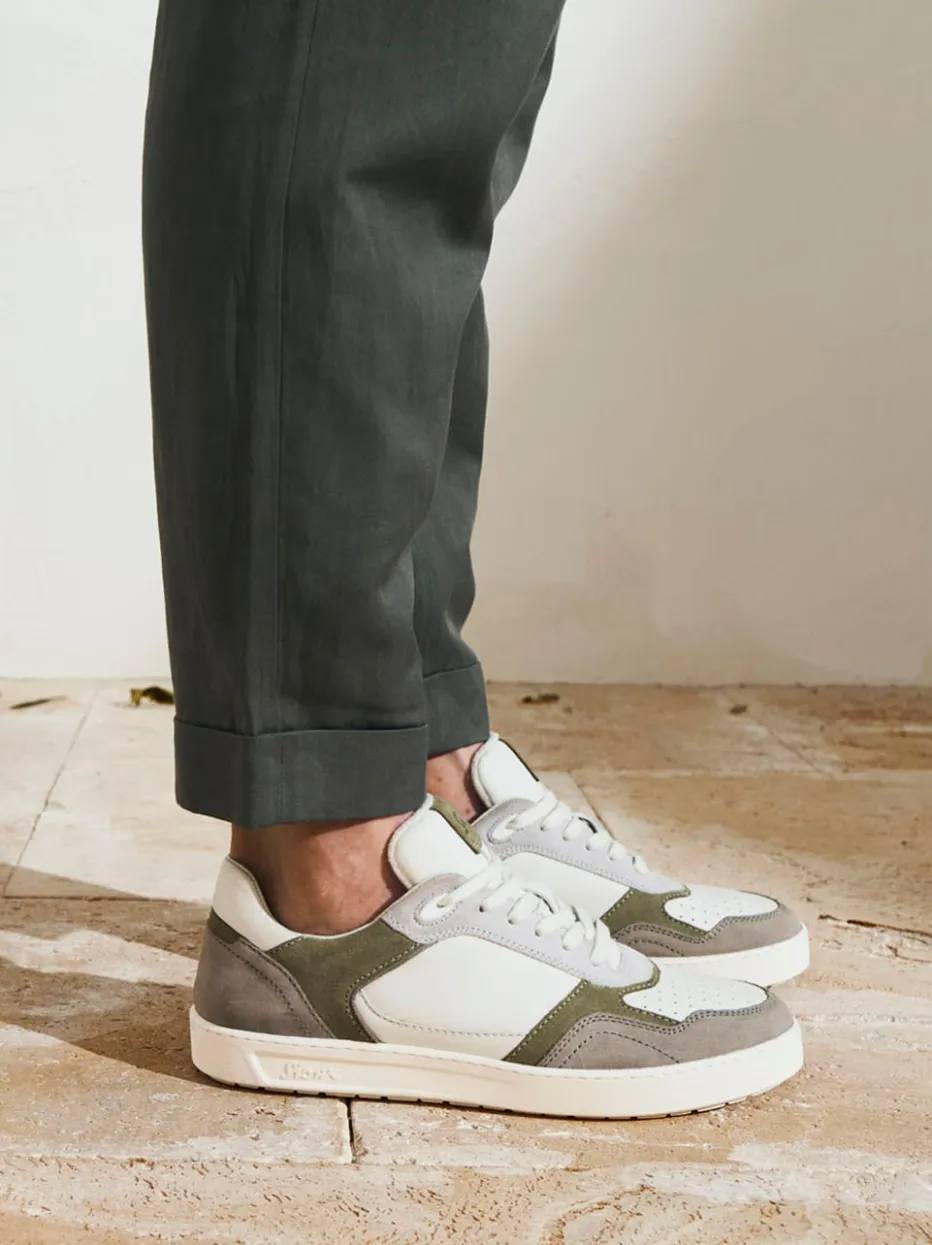 Hochwertiges Kalb- und Veloursleder trifft auf retroinspirierte Klarheit. Die Kombination aus perforierter Zehenkappe, tonalen Overlays und flexibler Sohle sorgt für Komfort und Stil im Alltag.