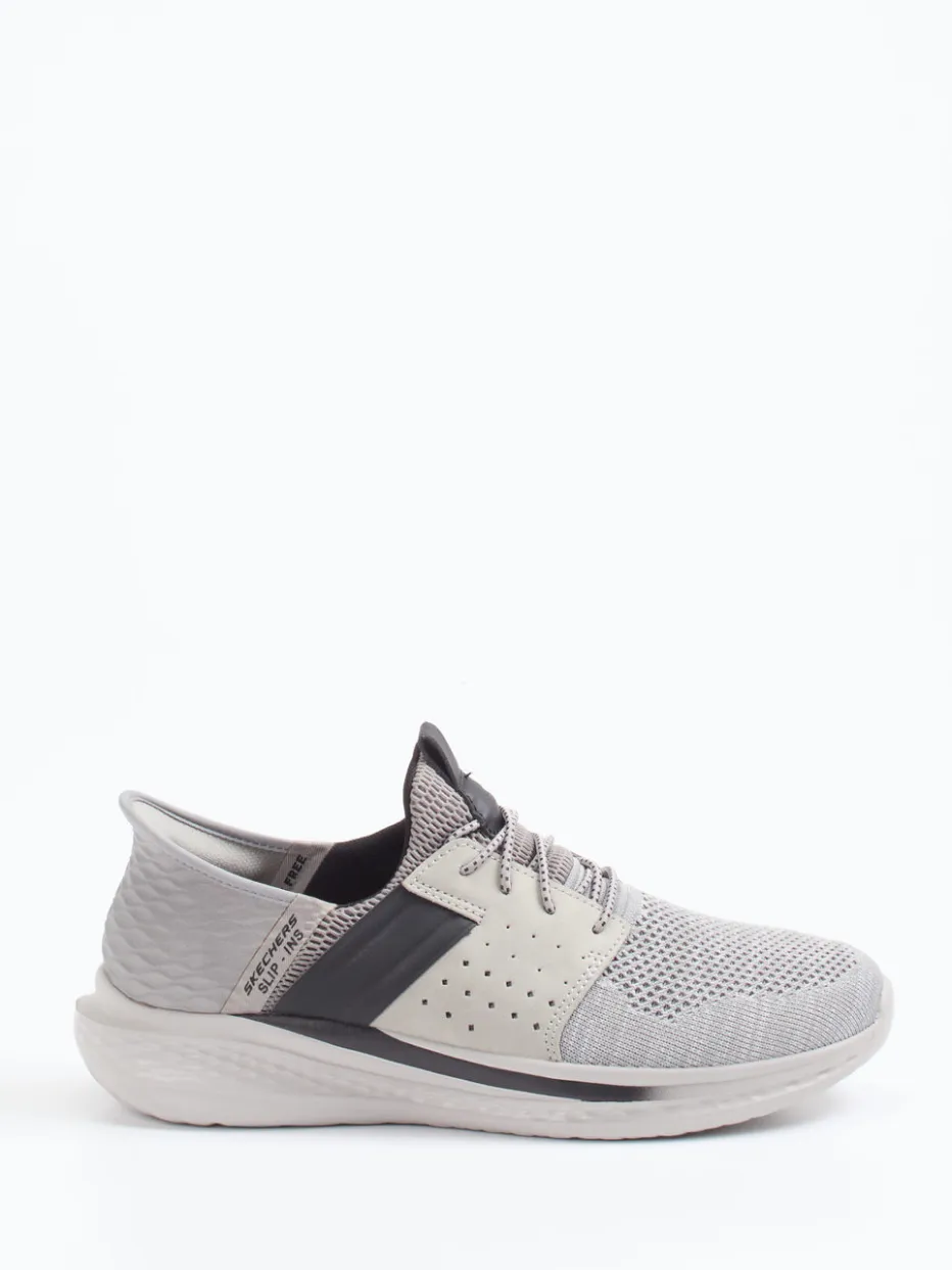 Leichte Alltagssneaker mit Technik-Flair.Skechers präsentiert diesen komfortorientierten Slip-On Sneaker für Freizeit und Bewegung. Ob auf kurzen Wegen oder im urbanen Lifestyle – dieser Unisex-Sneaker überzeugt mit einer strukturierten Oberfläche aus atmungsaktivem Textil und synthetischen Elementen. Der Schaft in Hell- und Dunkelgrau harmoniert mit dem sportlich-dynamischen Schnitt und den perforierten Overlays. Der elastische Einstieg und die weich gepolsterte Ferse betonen den alltagsfreundlichen Komfort, während die profilierte Gummisohle Trittsicherheit bietet. Streetwear und Tech-Athleisure treffen hier auf minimalistisches Design. Skechers Komfort trifft funktionalen Zeitgeist – stilvoll und smart kombiniert.