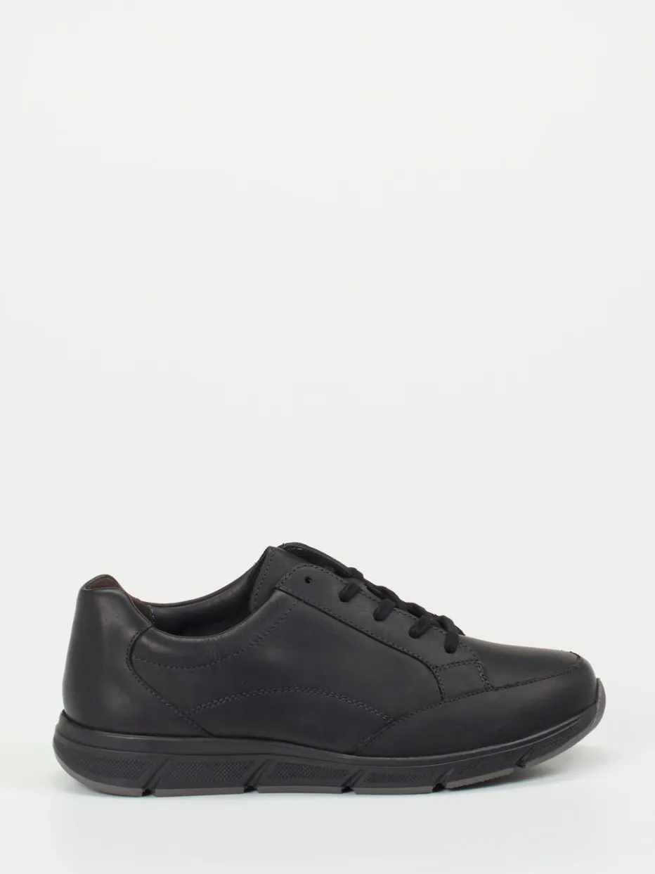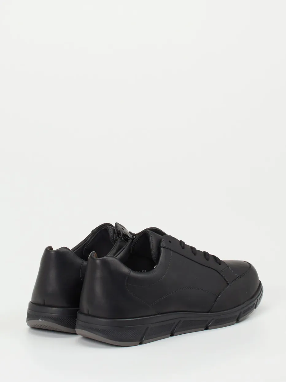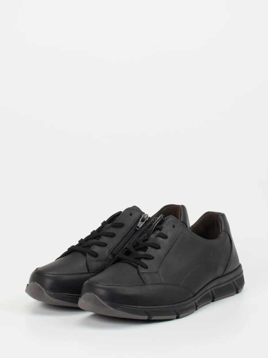 Stil trifft Funktion im Alltag.Solidus präsentiert diesen bequemen Herren-Komfort-Sneaker mit ergonomischer Ausstattung. Ideal für längere Tage auf den Beinen: Das atmungsaktive, schwarze Kalbleder zeigt sich matt und glatt, mit tonigen Nähten und seitlichem Reißverschluss für bequemes Anziehen. Die klassisch-runde Form und flexible Schnürung bieten hohen Komfort, während das herausnehmbare, lederbezogene Luftpolsterfußbett eigene Einlagen aufnimmt. Die stoßdämpfende Gummisohle gibt Halt im Alltag und bleibt rutschhemmend. Ein reduzierter Look im All-Black-Stil rundet das minimalistische Design ab. Solidus kombiniert orthopädischen Anspruch mit zeitloser Ästhetik für gehobene Alltagstauglichkeit.