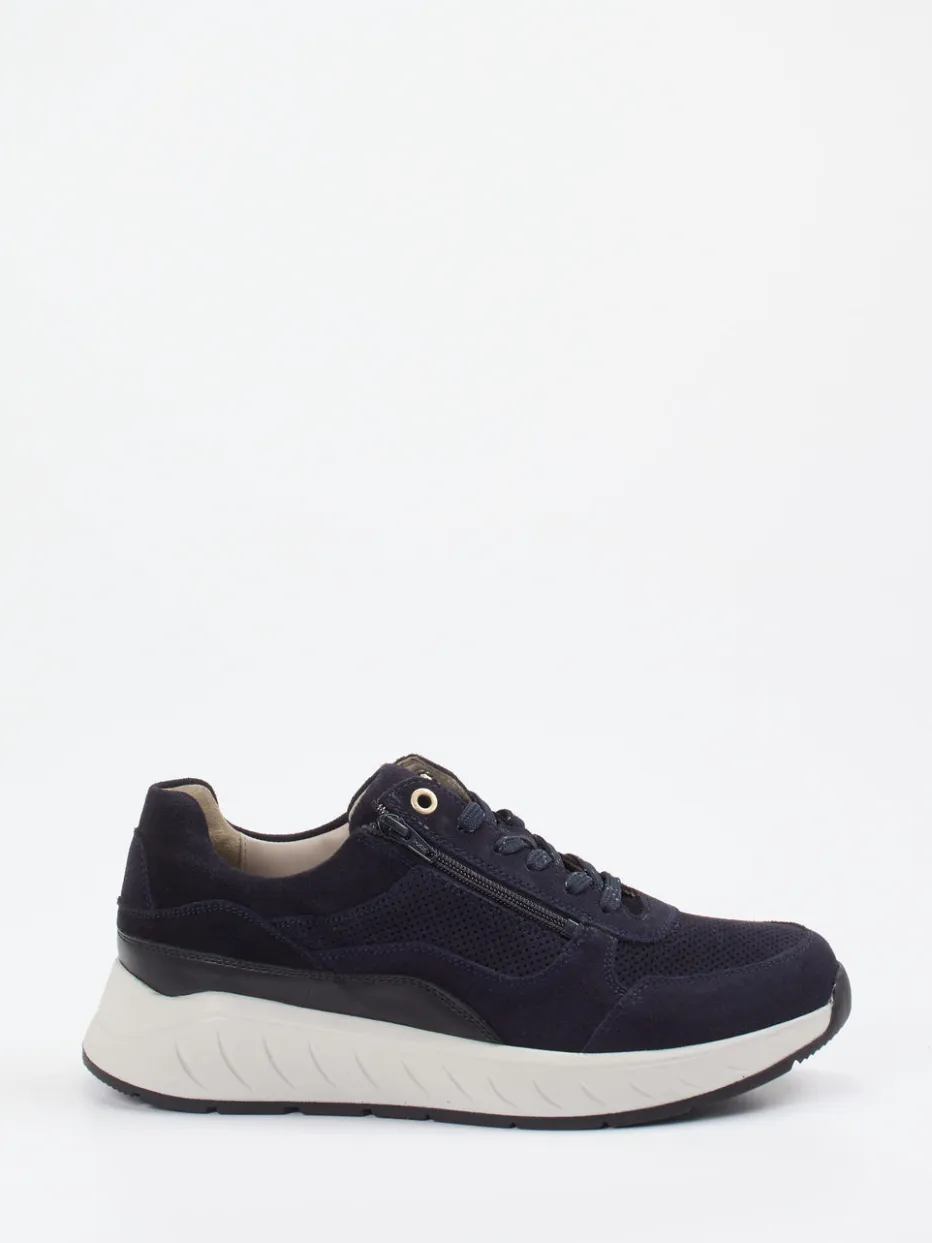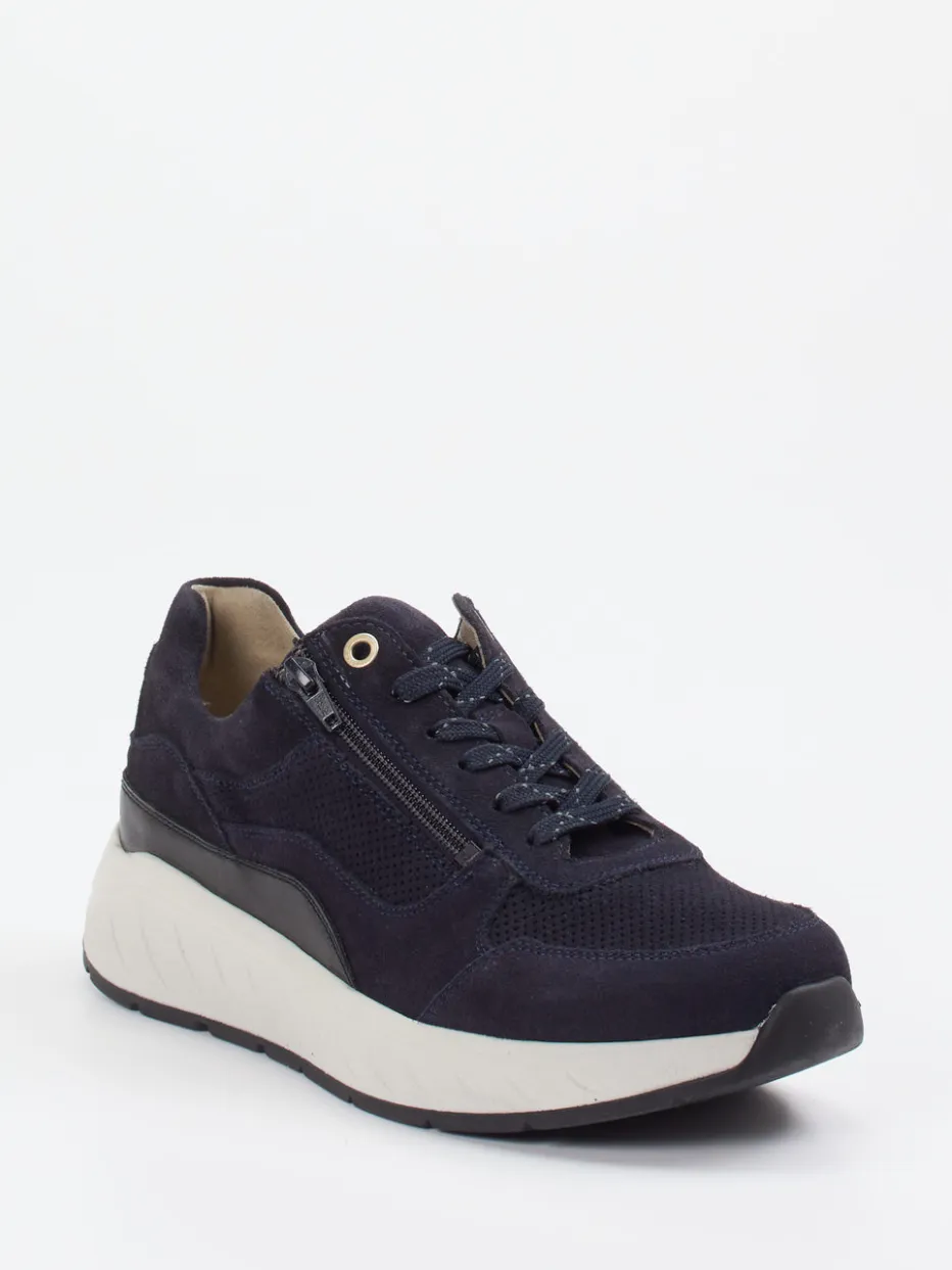 Für entspannte Wege mit Stil.Solidus präsentiert mit diesem Komfort-Sneaker ein Damenmodell für das tägliche Gehen mit maximalem Wohlgefühl. Das dunkelblaue Veloursleder ist samtig genarbt und wird durch perforiertes Mesh akzentuiert, wodurch ein angenehmes Fußklima entsteht. Die sportlich-voluminöse Silhouette samt ergonomischer Chunky-Sohle sorgt für eine sichere Bodenhaftung. Eine Schnürung mit Metallösen ergänzt den seitlichen Reißverschluss – ideal für schnelles An- und Ausziehen. Inspiriert vom Minimalismus passt der Sneaker perfekt in lässige Streetwear-Looks. Der weich gepolsterte Einstieg und die Luftpolstersohle bieten langlebigen Komfort im markentypischen Solidus-Stil.