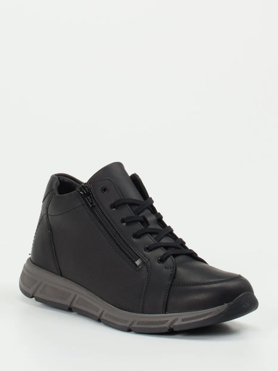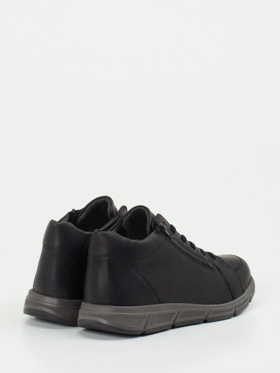 Für komfortorientierte Streetwear-Momente.Solidus präsentiert mit diesem schwarzen Mid-Top Sneaker ein Modell für komfortbewusste Herren. Ob für den Alltag in der Stadt oder entspannte Stunden zu Hause: Das atmungsaktive Kalbleder mit samtiger, matter Oberfläche und sanft strukturierter Mesh-Anmutung sorgt für angenehmes Fußklima. Mit knöchelhoher Silhouette, Ton-in-Ton Reißverschluss seitlich und klassischer Schnürung ist der Sneaker modern-minimalistisch gestaltet. Die rutschhemmende Gummisohle bietet Sicherheit, das gepolsterte Innenfutter wärmt – selbst an kühleren Tagen. Dank Weite K und herausnehmbarem Fußbett ideal für sensible Füße oder orthopädische Einlagen. Urban Utility trifft Komfort. Komfortkompetenz von Solidus – intelligent designt für Alltag und Anspruch.
