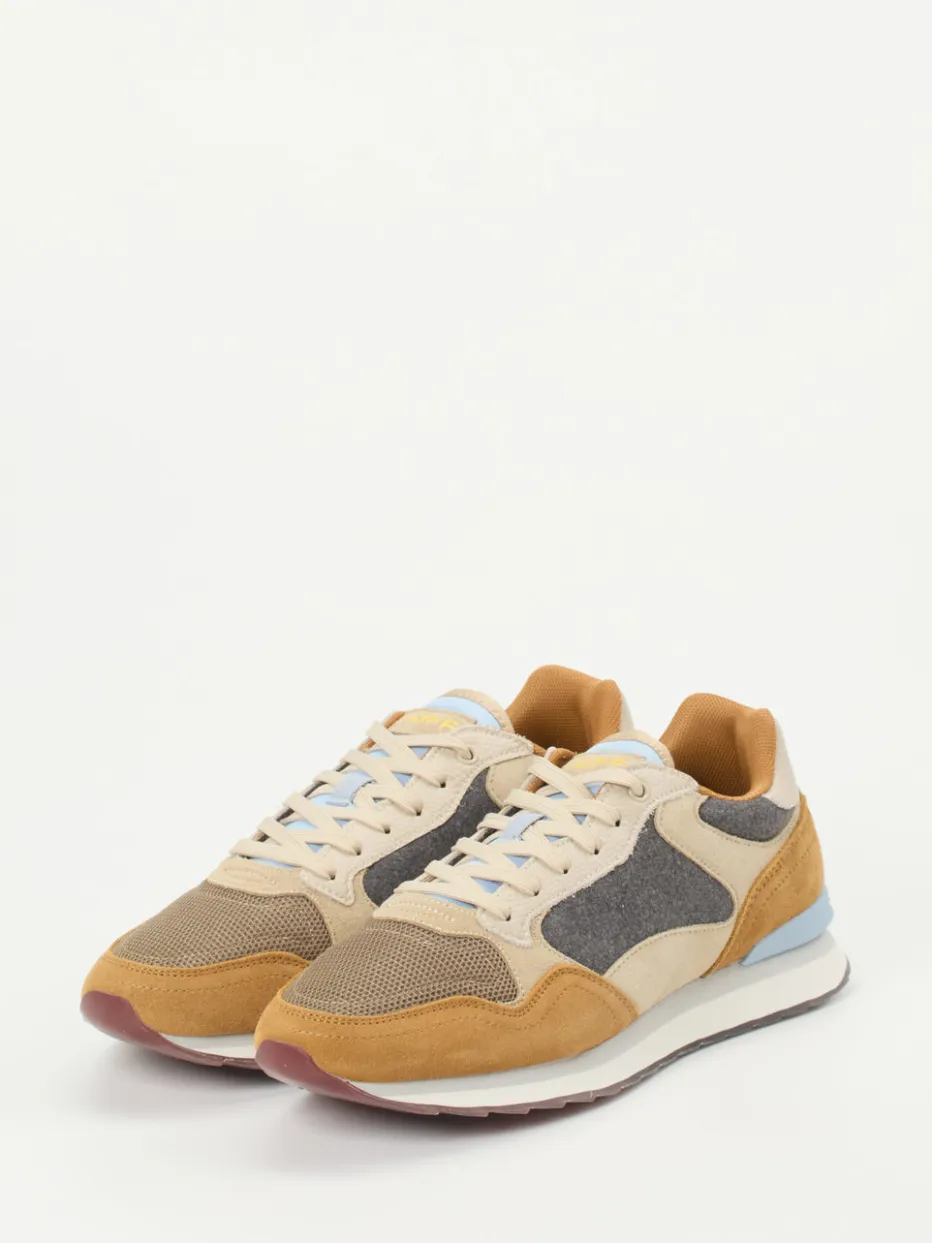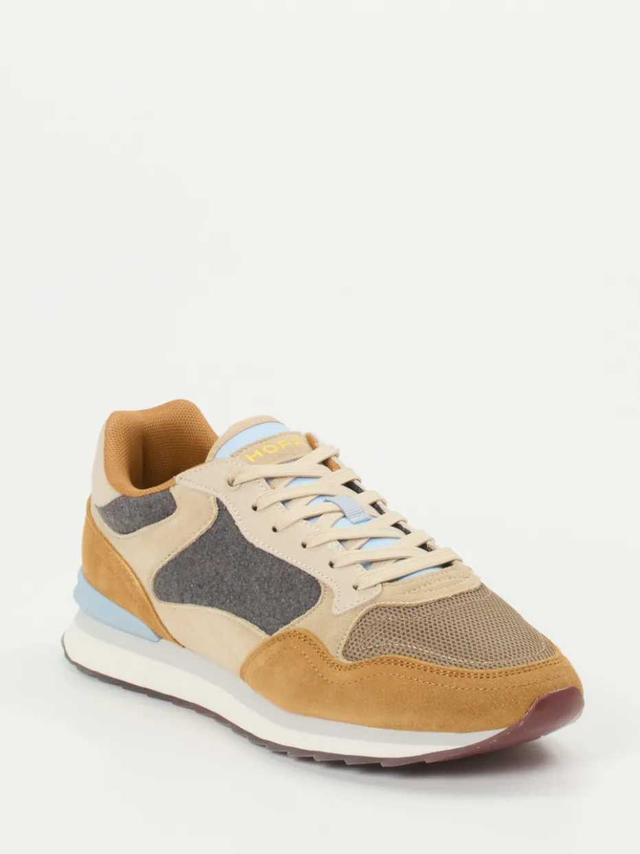 Style im Zeichen der 80er.THE HOFF BRAND interpretiert mit diesem Herren-Sneaker die klassische Runner-Silhouette mit modernem Twist. Für entspannte City- und Freizeitmomente designt, überzeugt das Modell mit einem edlen Materialmix aus samtig angeschliffenem Veloursleder, atmungsaktivem Mesh und filzartigem Textil. Warme Beige- und Brauntöne treffen auf Kontrastdetails in Hellblau und Gelb, während die strukturierte Gummisohle mit transluzenten Akzenten einen sicheren Tritt garantiert. Der gepolsterte Schaft und die verstärkte Fersenkappe unterstreichen den Komfortanspruch. Kombiniert mit Jogpants oder Jeans entsteht ein stilsicherer Streetstyle. Hoff steht hier für Designkompetenz und komfortorientierte Ästhetik.