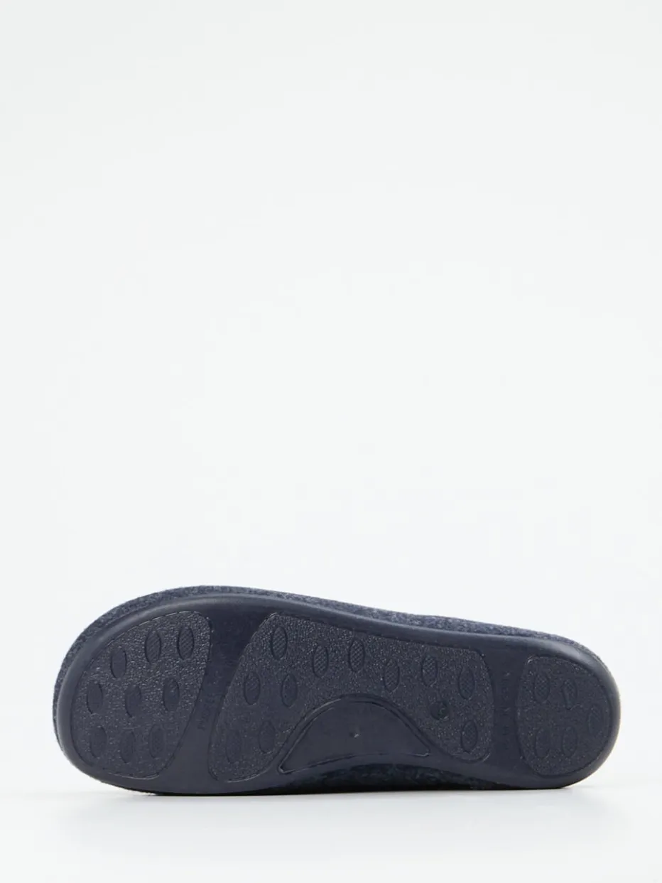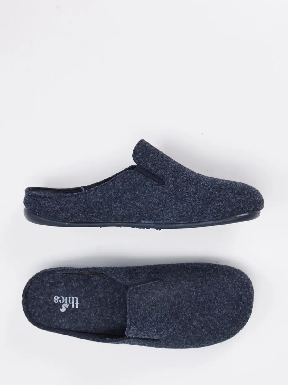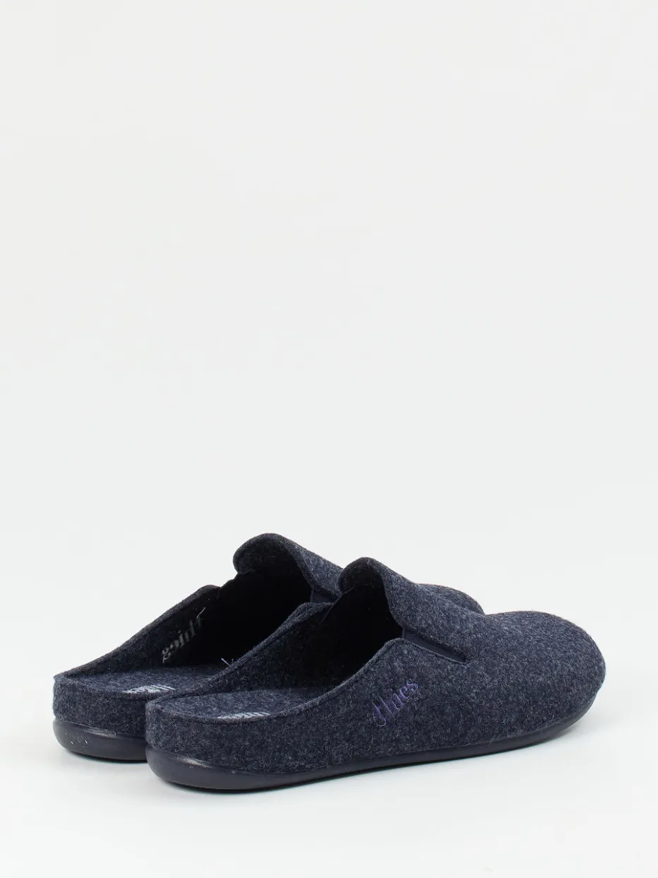 Wohlfühlkomfort im puristischen Design.Die Marke Thies präsentiert mit diesen Hausschuhen eine moderne Loungewear-Interpretation. Ob beim Entspannen nach einem langen Tag oder beim gemütlichen Sonntagsfrühstück – der angenehm weiche Filz in tiefem Dunkelblau umschließt den Fuß wohltuend. Ton-in-Ton gehaltene Nähte und eine dezente Logo-Stickerei unterstreichen die schlichte Ästhetik. Die geschlossene Vorderpartie geht in eine offene Ferse über und ermöglicht damit schnelles Reinschlüpfen. Gepolstert, rutschhemmend und mit elastischen Einsätzen ergänzt, genügen sie höchsten Ansprüchen an Komfort und Funktionalität. Ideal kombinierbar mit weichen Loungewear-Teilen in Naturtönen. Perfekt für ruhige Stunden mit Stilanspruch und nachhaltigem Anspruch.