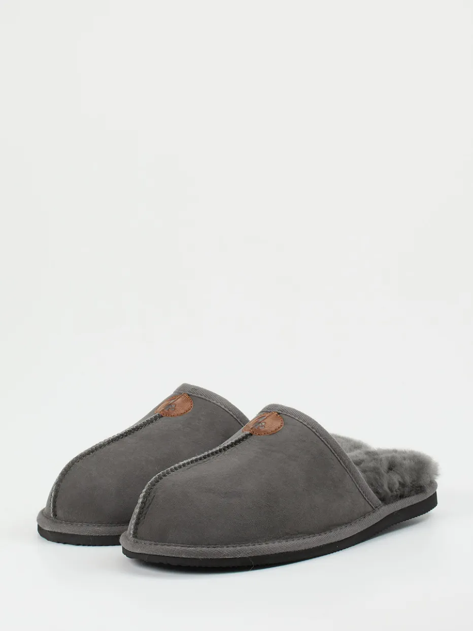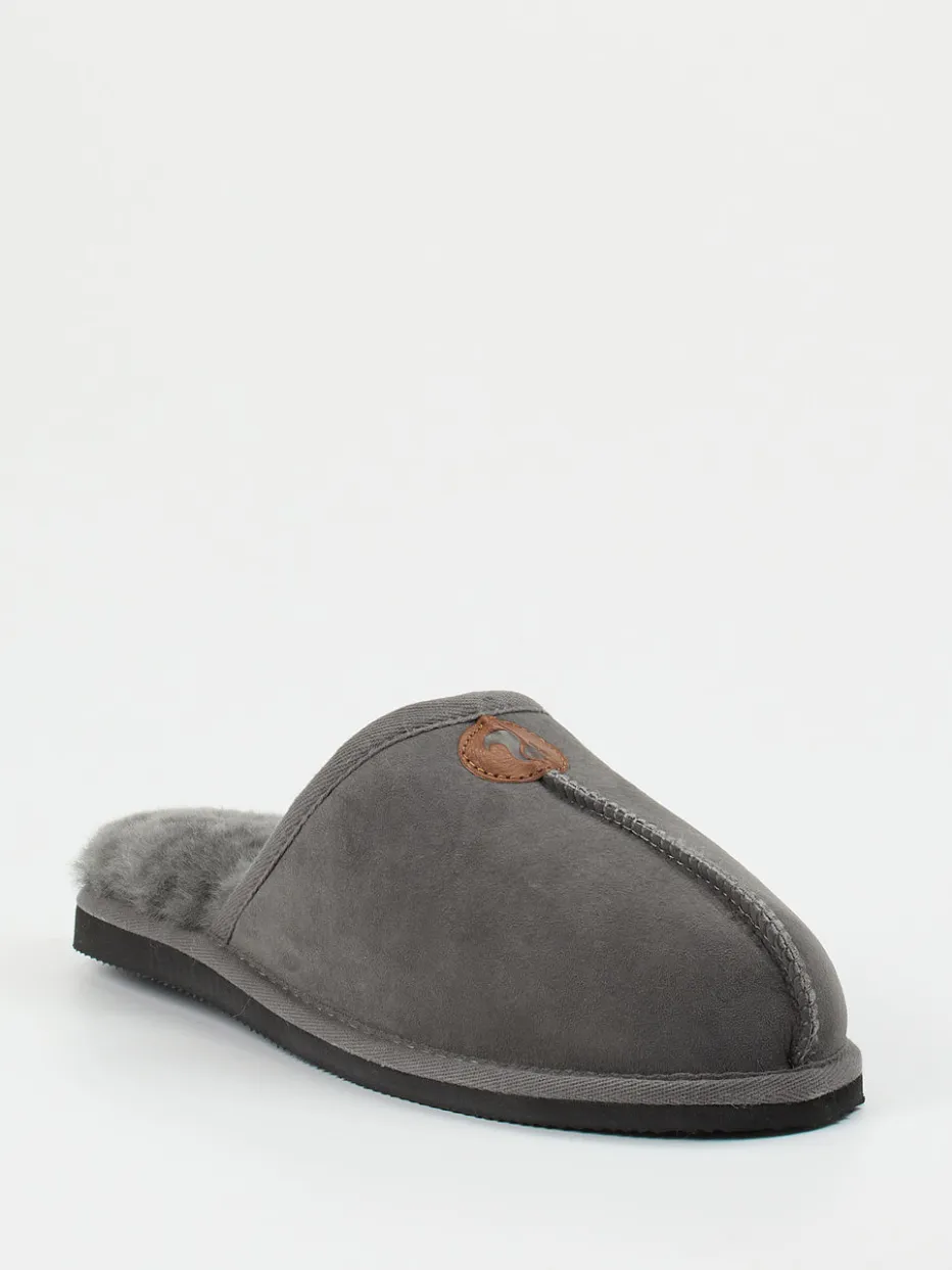 Wärmender Komfort für Zuhause.Thies präsentiert mit diesen Pantoffeln einen stilvoll-minimalistischen Begleiter für gemütliche Momente daheim. Wenn kühle Fußböden zur Herausforderung werden, überzeugt dieses Modell durch seine Kombination aus grauem Veloursleder und dichter Lammfellfütterung. Die matte Oberfläche wird durch eine sichtbare Mittelnaht und ein braunes Logo-Patch betont. Der offene Fersenbereich und die ergonomisch abgerundete Form sorgen für bequemes An- und Ausziehen. Eine profilierte Gummisohle bietet rutschfeste Stabilität. Inspiriert von Cosiness- & Natural-Tones-Trends ist es perfekt für Loungewear-Looks mit Wollsocken oder Fleece-Hosen. Natürlich gefüttert, handwerklich durchdacht – spürbare Qualität von Thies.