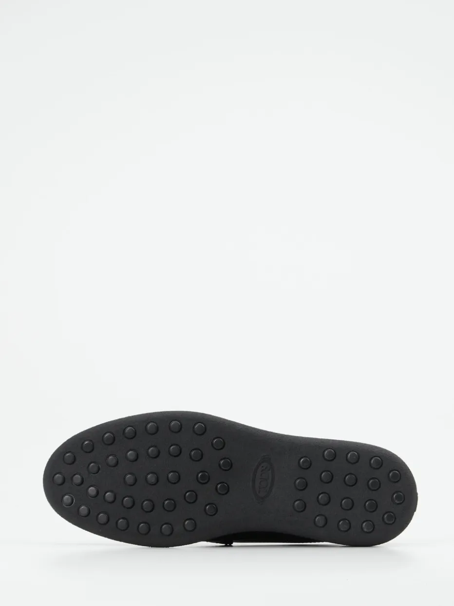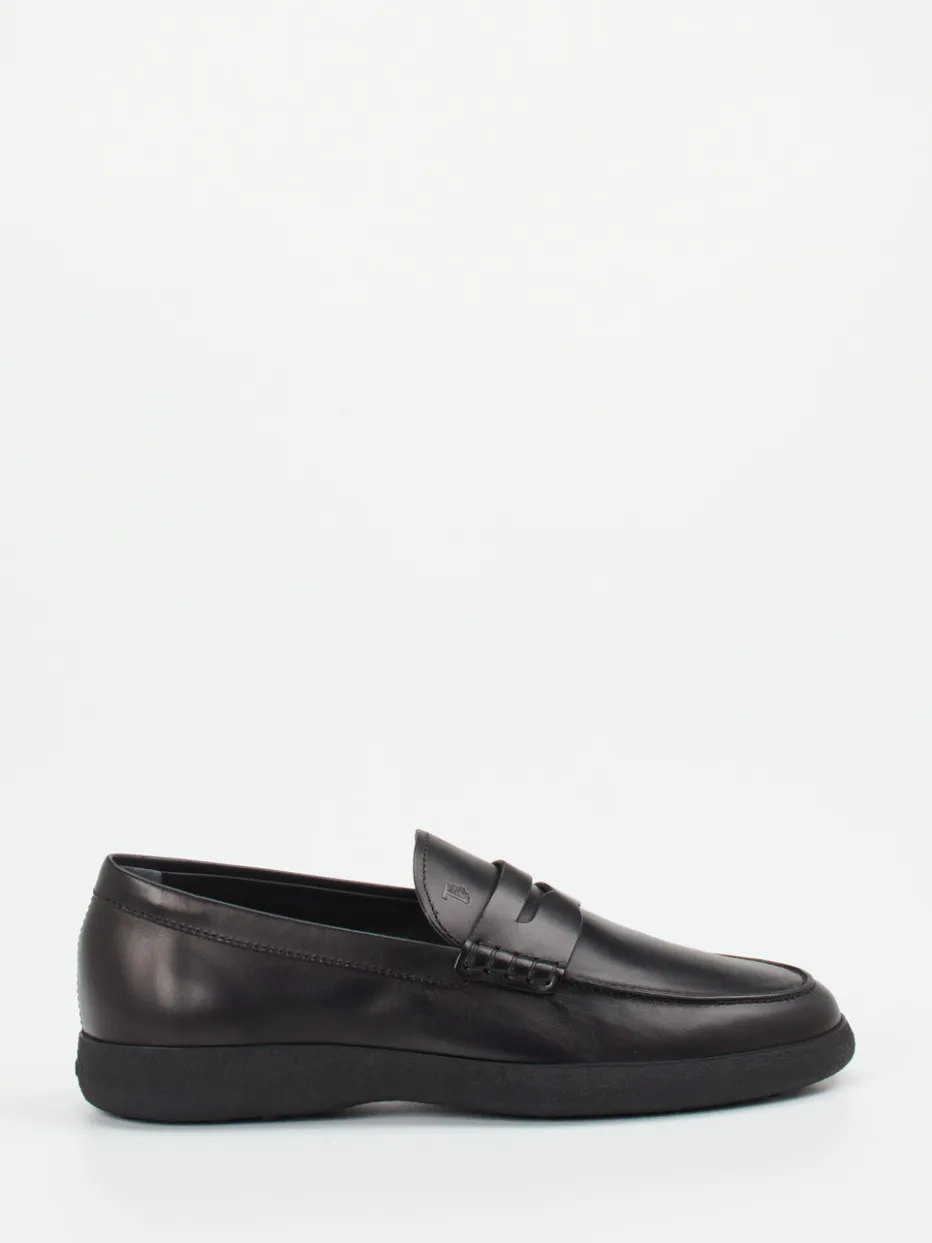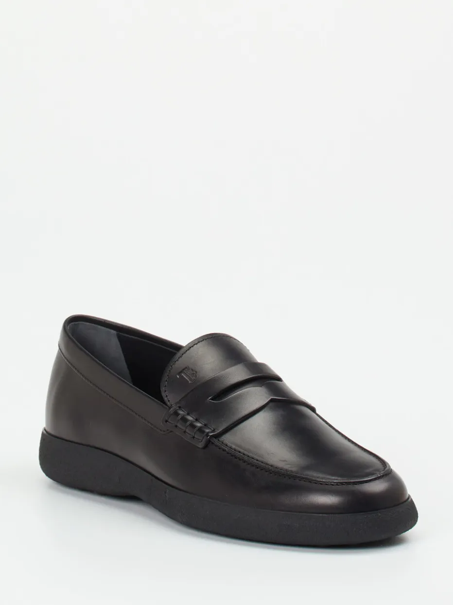 Eleganz im Alltag neu gedacht.Tod’s interpretiert den klassischen Herren-Loafer mit edlem Kalblederstark und stilvoll. Ob urbaner Pendelweg oder Meeting im Office – das tiefschwarze, glänzende Kalbleder mit tonalen Steppnähten wirkt gleichermaßen hochwertig wie zurückhaltend. Die flache Silhouette mit charakteristischer Zunge im Penny-Stil und das dezente Logo auf dem Spann zeigen italienische Eleganz mit Understatement. Eine weiche Lederfütterung und das gepolsterte Wechselfußbett bieten Komfort, während die profilierte Gummisohle mit Noppen sicheren Tritt verleiht. Minimalistische Preppy-Optik trifft hier auf Funktion und langlebigen Stil. Ein luxuriöser Klassiker mit Signatur-Charakter von Tod’s.