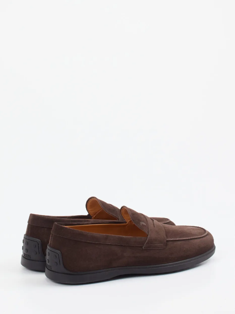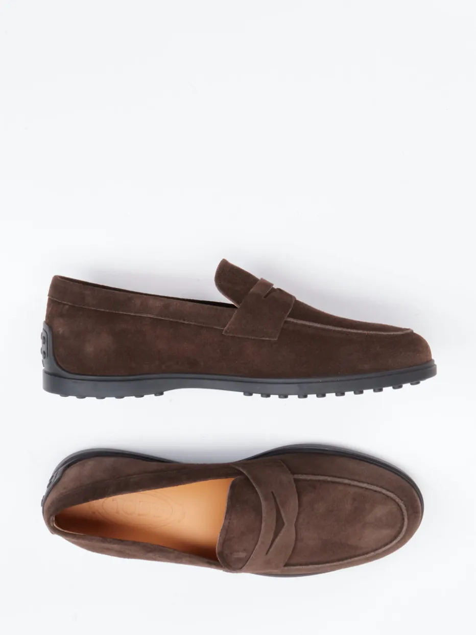 Understatement mit Format.Tod’s präsentiert mit diesem Herrenloafer ein Modell, das dezente Eleganz in den Alltag bringt. Ideal für entspannte Office-Tage oder stilvolle City-Walks: Der Slipper aus dunkelbraunem Veloursleder zeigt sich samtig-matt und bietet dank klassischer Silhouette und Penny-Strap einen souveränen Auftritt. Die profilierte Gummisohle mit geprägtem Logo sorgt für Stabilität und Komfort. Ton-in-Ton-Nähte und ein edles Lederfutter unterstreichen das cleane Design. Inspiriert von der Preppy-Ästhetik vergangener Jahrzehnte, passt er zu Chinohose und Pullover ebenso wie zu Soft Tailoring. Ein authentisches Statement für leise Luxusmomente mit langer Tradition.