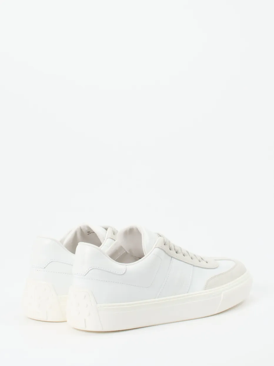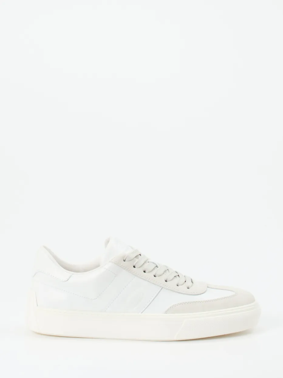 Dezenter Stil mit urbaner Leichtigkeit.Tod’s präsentiert mit diesem Low-Top-Sneaker ein Modell für stilbewusste Puristen. Ideal für Alltag, Freizeit und Business-Casual kombiniert der Sneaker weiches Kalbleder mit samtig angeschliffenem Veloursleder in Off-White und Hellgrau. Die klassische Rundform, tonale Schnürung und eine geprägte Fersenverstärkung mit markanter Noppenstruktur prägen das reduzierte Design. Eine strukturierte Gummisohle mit Fischgrät-Profil sorgt für Bodenhaftung, während das weiche Innenfutter und das herausnehmbare Fußbett funktionalen Komfort bieten. Inspiriert von Quiet Luxury und Streetwear-Klassikern der Saison. Ein dezenter Premium-Sneaker für stilsichere Kombinationen und urbanen Minimalismus.