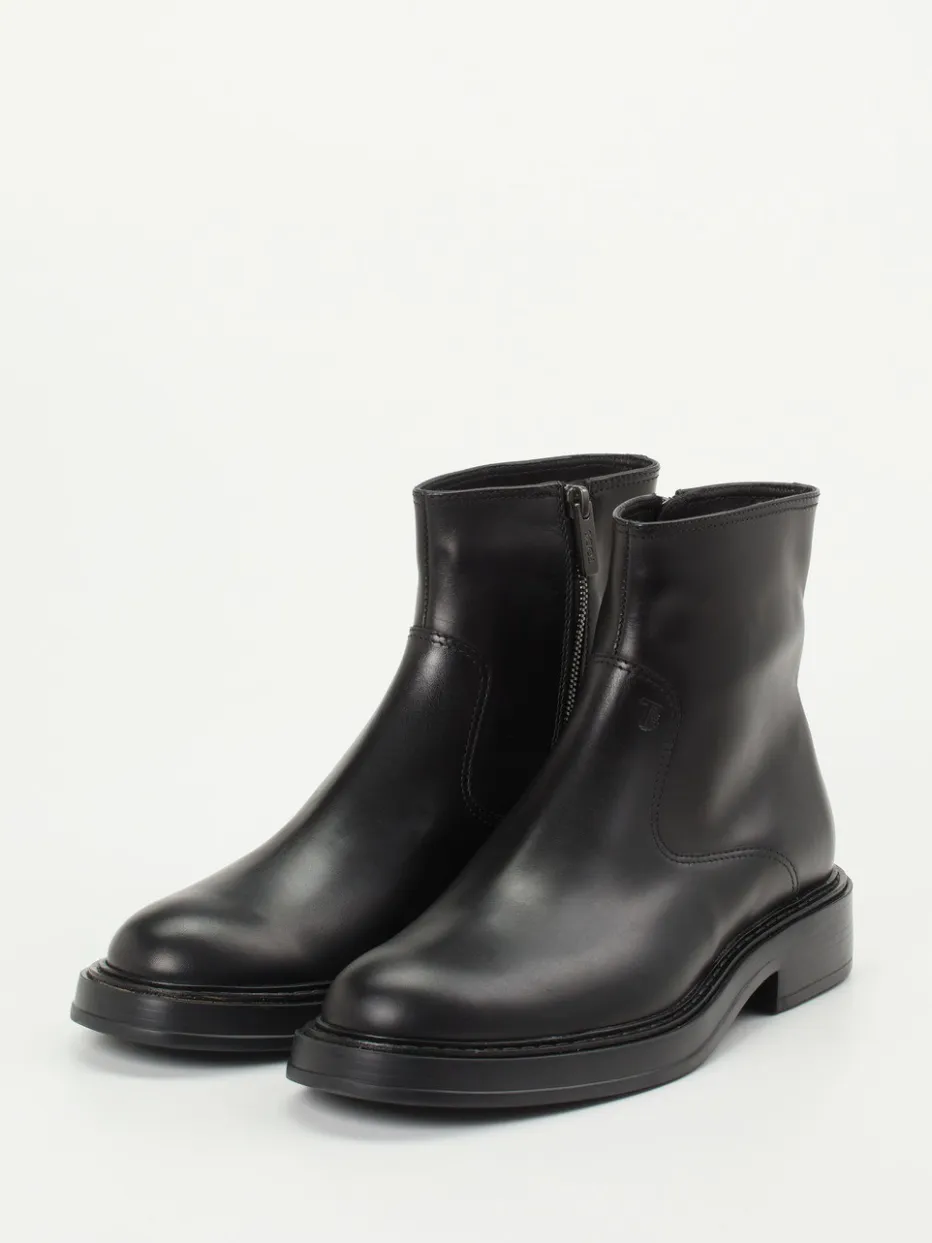 Minimalismus auf höchstem Niveau.Die Marke Tod’s präsentiert mit diesen Stiefeletten ein stilvolles Unisex-Modell für Alltag und Büro. Die knöchelhohen Reißverschluss-Boots erfüllen mit ihrem schwarzen Kalbleder – hochwertig verarbeitet und dezent glänzend – höchste Ansprüche an Ästhetik und Funktion. Eine klassische, anklehohe Silhouette trifft auf eine profilierte Gummisohle mit stabiler Wirkung. Tonale Nähte, ein innenliegender Reißverschluss sowie feines Branding an der Außenseite unterstreichen den minimalistischen Look im Geist von „Quiet Luxury“. Ideal kombinierbar mit einem Wollmantel und schwarzem Gürtel. Handwerkliche Qualität und zeitloses Understatement – typisch Tod’s.