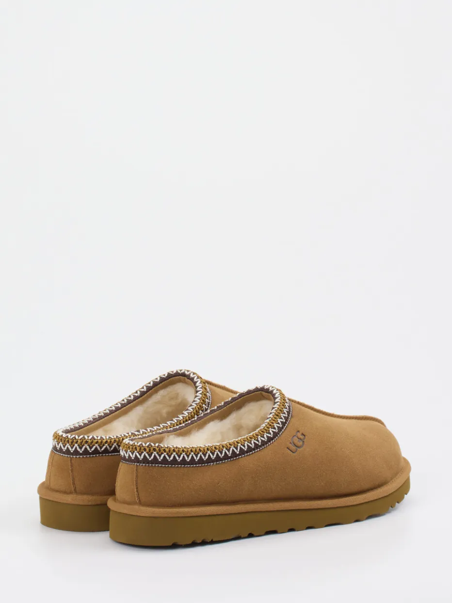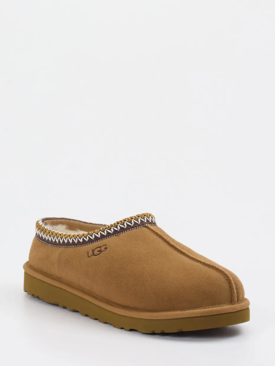 Für lässigen Komfort an kalten Tagen.Die Marke UGG präsentiert diesen komfortorientierten Hausschuh-Slipper aus der Herbst/Winter-Kollektion. Ob auf dem Sofa oder schnellen Schritten vor die Tür: Das cognacbraune Veloursleder mit matter Oberfläche und kontrastierender Zickzack-Borte bringt Stil in jeden entspannten Moment. Das dichte Innenfutter aus echtem Lammfell schenkt angenehme Wärme, während die profilierte Gummisohle zuverlässige Haftung auch auf glatten Untergründen bietet. Die offene Fersenpartie erleichtert das Anziehen, die Silhouette ist reduziert-modern gehalten. Perfekt zu Kuschelsocken oder Relaxwear kombinierbar. Markentypischer Komfort trifft cozy Loungewear-Appeal.