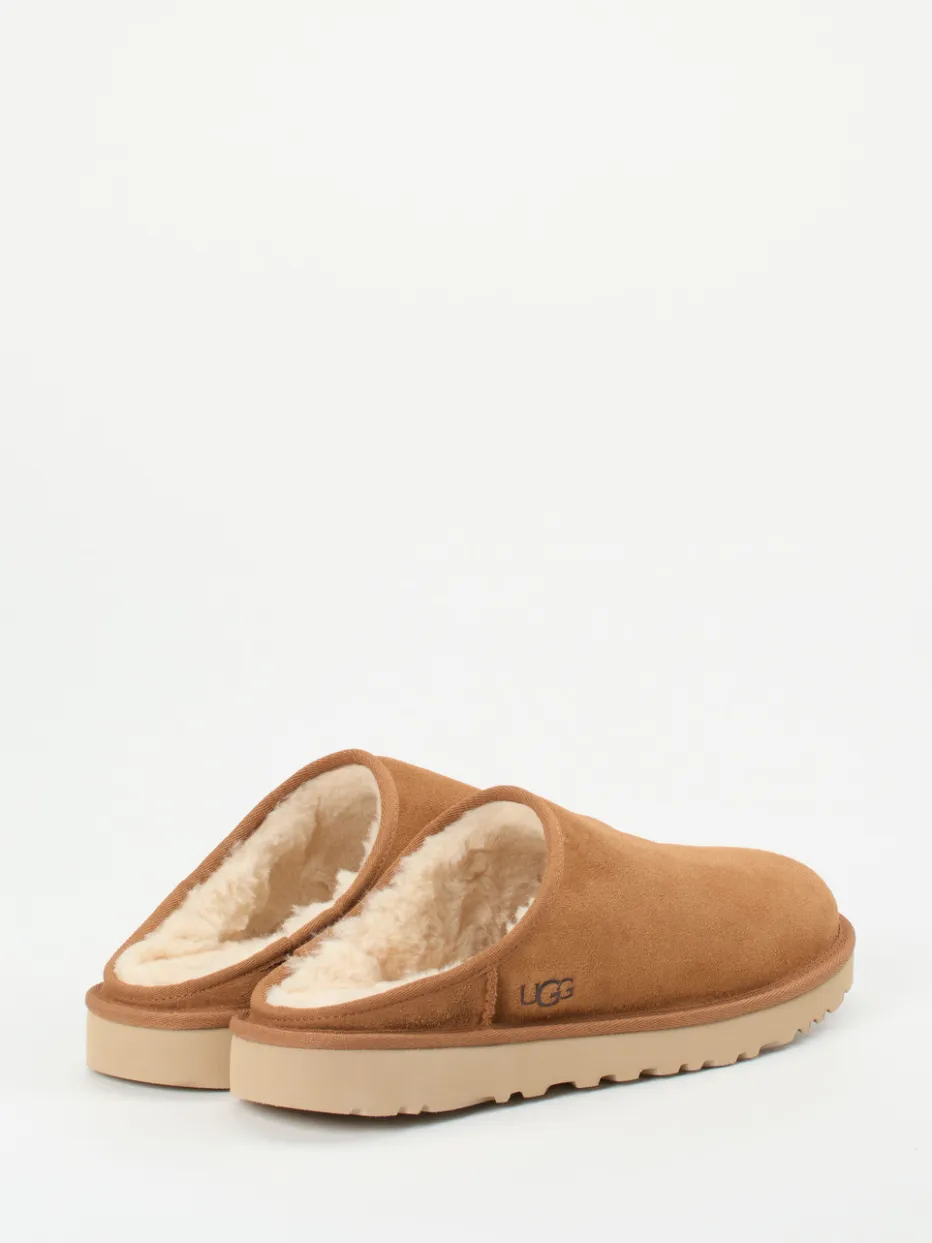 Wohltuende Wärme für entspannte Winterabende.Die Marke UGG präsentiert mit diesen Hausschuhen eine komfortorientierte Lammfell-Pantolette. Ideal für ruhige Stunden daheim: Das flauschige Lammfellfutter sorgt für wohlige Wärme, während sich das samtig-matte Veloursleder in Nussbraun angenehm anschmiegt. Die offene Ferse ermöglicht einfaches Hineinschlüpfen, eine profilierte Gummisohle verleiht Trittsicherheit auf innen- wie kurzzeitig auf außenliegendem Boden. Die dezente Ton-in-Ton-Nahtführung und das geprägte Markenlogo unterstreichen den minimalistischen Lounge-Charakter. Als stilvolle Ergänzung zur Homewear oder hochwertigem Loungewear-Outfit gedacht. Ein hochwertiges Winter-Essential mit Fokus auf Komfort und unaufdringlichen Stil.
