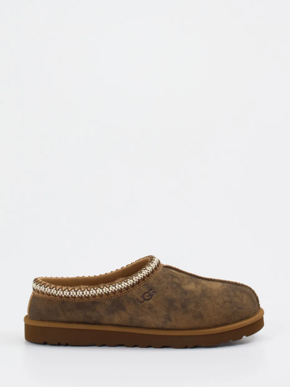 Wärme trifft lässige Ästhetik.UGG präsentiert klassische Hausschuhe aus der Kategorie Lammfell-Pantoffeln. Ideal für entspannte Tage daheim oder den Weg zum Briefkasten: Das Modell ist aus hochwertigem Veloursleder gefertigt, dessen samtig-matte Oberfläche durch ein warmes Mittelbraun unterstrichen wird. Ein naturbelassenes Lammfellfutter sorgt für wohlige Wärme, während die robuste Gummisohle mit Profil auch draußen zuverlässigen Halt bietet. Auffällig: die kontrastierende Textilborte entlang des Schaftrands. Die offene Ferse und die Schlupfform ermöglichen ein schnelles Anziehen. Modisch bewegen sich die Pantoffeln zwischen „Quiet Luxury“ und „Gorpcore“. Ein UGG-Klassiker, der Komfort mit unaufdringlichem Stil verbindet.