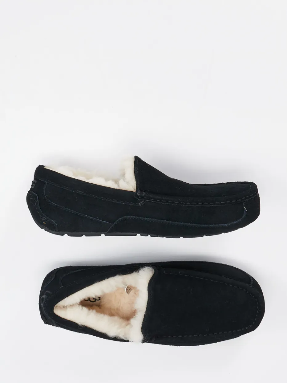 Warme Geborgenheit in stilvollem Gewand.UGG interpretiert mit diesem Herrenschuh die Kategorie Hausschuh neu. Ideal für entspannte Stunden zu Hause sorgt das samtig-matte schwarze Veloursleder mit tonalen Steppnähten für eine ruhige Optik und angenehme Haptik. Vollständig mit dichtem, cremeweißem Lammfell gefüttert, bietet der Mokassin-Slipper wohlige Wärme. Die flache Silhouette in Schlupfform erlaubt schnelles Anziehen, während die gummierte Laufsohle mit Profil auch kurze Wege nach draußen meistert. Inspiriert vom skandinavischen Komfortstil trifft dieser Schuh den Cozy-Core-Trend der Saison. Die Kombination mit edler Loungewear oder Softknit ist besonders harmonisch. Ein stilvoller Wohlfühlbegleiter mit funktionalem Anspruch und UGG-Komfort.