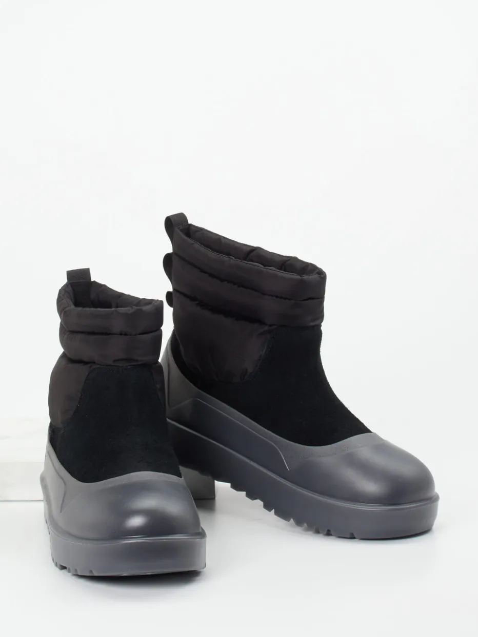 Funktion trifft Form im Winterlook.Die Marke UGG präsentiert robuste Winter-Stiefeletten für den Alltag und Outdoor-Einsatz. An kalten Tagen bieten diese knöchelhohen Boots mit matt strukturiertem Finish zuverlässigen Schutz. Die Kombination aus samtig angeschliffenem Veloursleder, gestepptem Nylon und Gummielementen überzeugt durch Funktionalität und Ästhetik. In tiefem Schwarz setzen sie auf ein reduziertes Ton-in-Ton-Design mit Utility-Charme. Der Schaft ist warm gefüttert, die profilierte Gummisohle gibt stabilen Halt auf Schnee und Matsch. Dank Schlupfform sind sie schnell angezogen – perfekt im Gorpcore- oder Streetstyle kombinierbar. Ein Allrounder mit markentypischem Komfort und durchdachtem Wetterschutz.