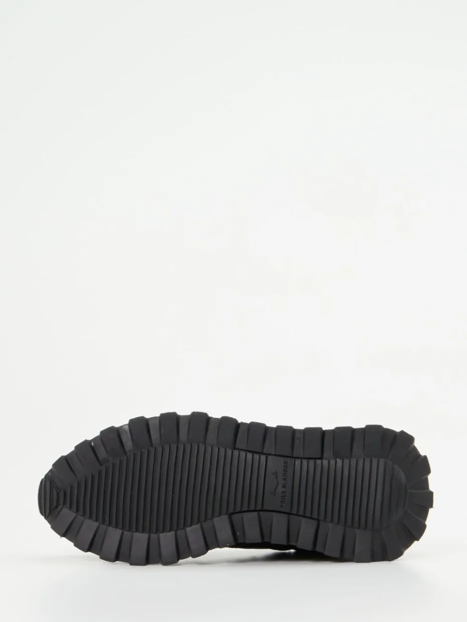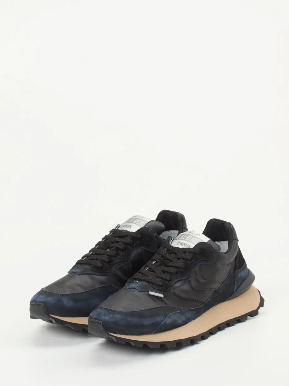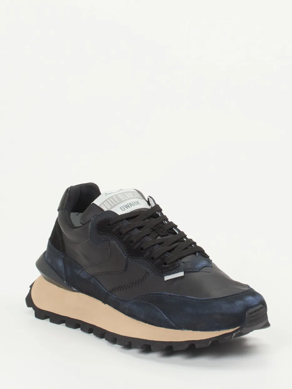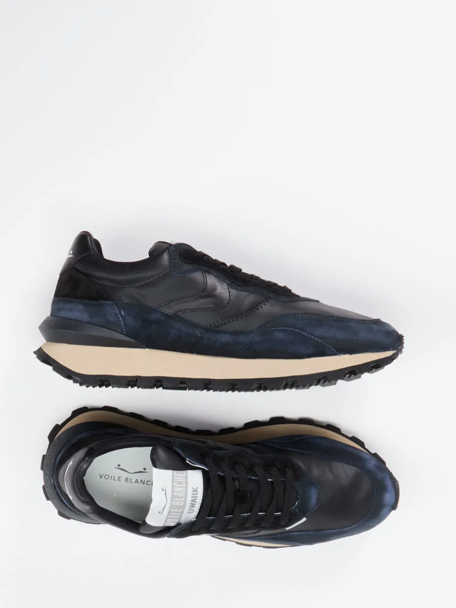 Voile Blanche präsentiert einen Herren-Sneaker im angesagten Retro-Runner-Stil. Inspiration aus dem Laufsport trifft auf markantes Design: Der Qwark-Sneaker kombiniert dunkelblaues Veloursleder mit schwarzem, gewachstem Textil sowie einem vollständig mit Kalbleder gefütterten Innenleben. Seine kontrastreiche Chunky-Gummisohle in Creme und Schwarz sorgt nicht nur für maximale Traktion, sondern setzt Design-Akzente. Die tonale Schnürung und das dezente Logo auf Zunge und Ferse runden den sportlich-flachen Look ab. Ideal für Alltagslooks mit Jogpants oder moderner Streetwear. Der Sneaker überzeugt mit durchdachtem Komfort und souveräner Stilführung im urbanen Kontext.