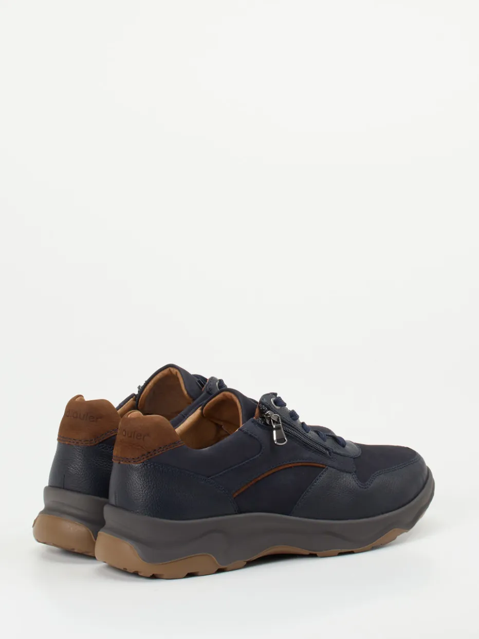 Bequemer Alltagsbegleiter mit Funktion.Waldläufer präsentiert einen Herrensneaker aus der Komfortlinie. Für aktive Tage und längere Spaziergänge bietet dieser Komfort-Sneaker zuverlässigen Halt und angenehmen Tragekomfort. Dunkelblaues Kalbleder – teils glatt, teils samtig angeschliffen – trifft auf eine flexibel profilierte Gummisohle in Anthrazit und Mittelbraun. Der doppelte Verschluss mit Schnürung und seitlichem Reißverschluss erleichtert das An- und Ausziehen. Das gepolsterte Wechselfußbett und die hochwertige Innenausstattung sorgen für Wohlgefühl bei jedem Schritt. Gorpcore-Einflüsse und ein dezenter Markenakzent an der Ferse unterstreichen den aktuellen Look. Lässt sich stilvoll mit Jeans und Funktionsjacke kombinieren. Komfort, Verarbeitung und Design – verlässlich Waldläufer.