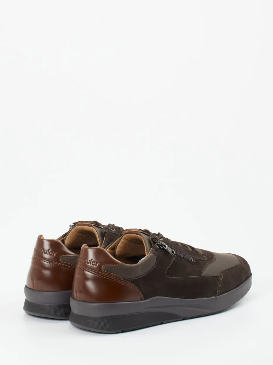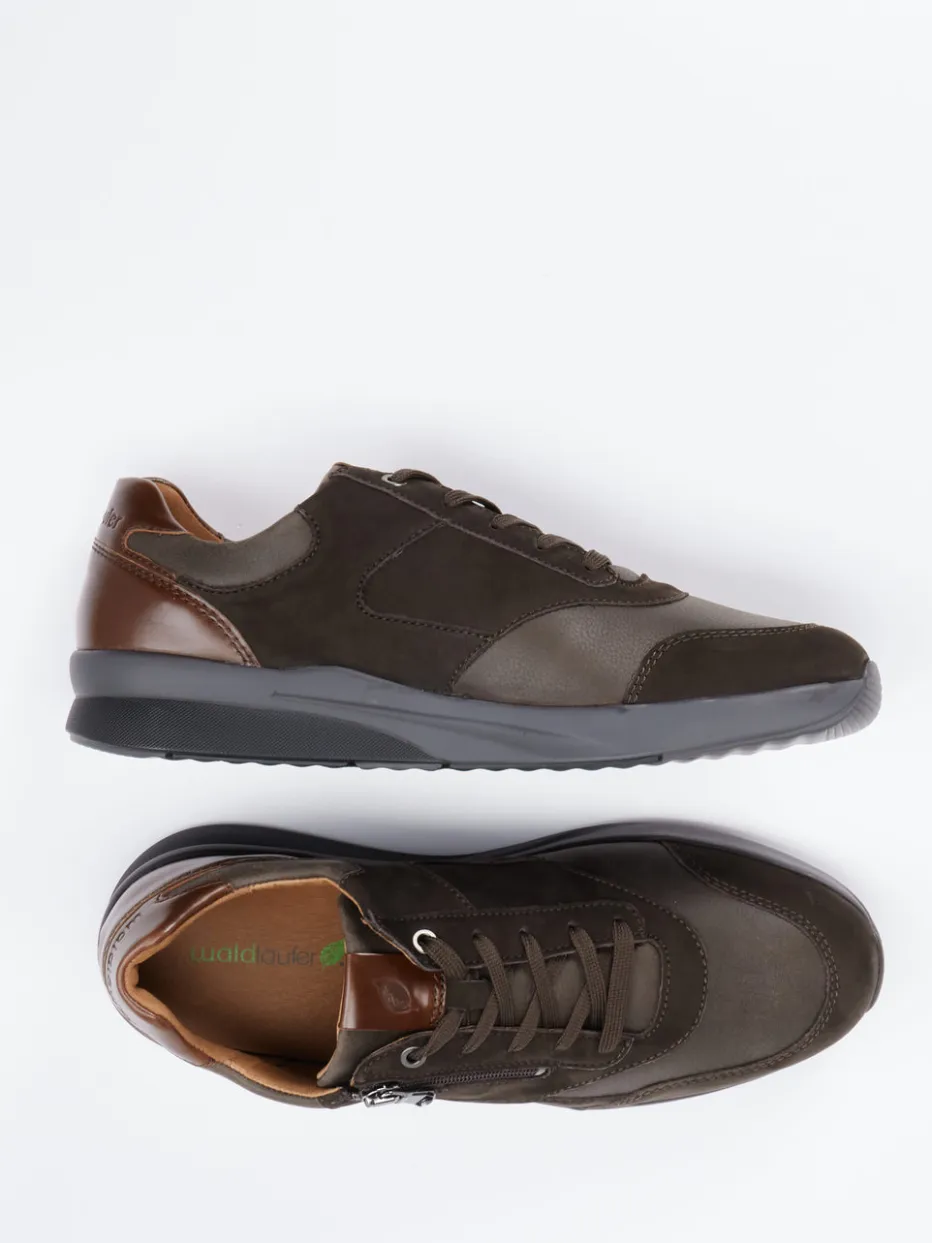 Bequemer Stil für aktive Tage.Waldläufer präsentiert mit diesem Komfort-Sneaker ein durchdacht gestaltetes Herrenmodell für den Alltag. Ideal für entspannte Freizeitmomente bietet der Schnürschuh einen Materialmix aus braunem Nubukleder – samtig angeschliffen – mit glatten Ledereinsätzen im Fersenbereich. Der seitliche Reißverschluss in Silberoptik ergänzt die klassische Schnürung und erleichtert den Einstieg. Die Gummisohle mit funktionalem Profil unterstützt sicheres Laufen, während die sportlich-legere Silhouette dem „Comfort Core“-Trend entspricht. Ton-in-Ton-Nähte und eine dezente Farbgebung runden das minimalistische Design ab. Passt hervorragend zu Jeans, Chinos oder Cordhosen. Waldläufer steht für durchdachten Komfort und stilvolle Alltagstauglichkeit.