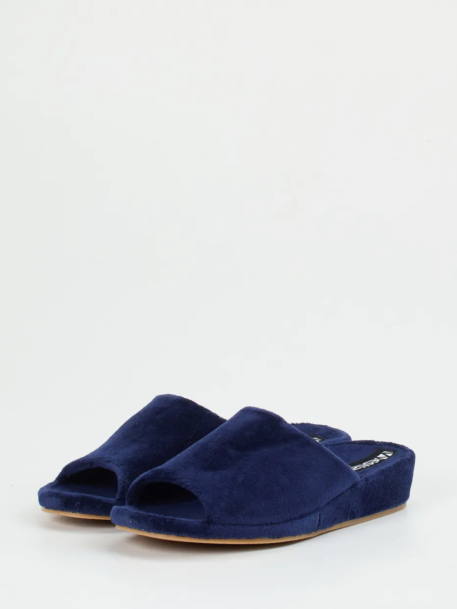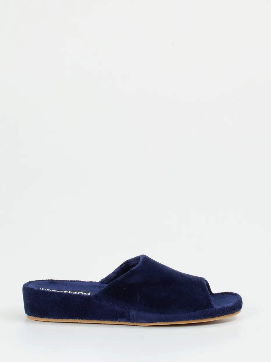 Gefertigt aus samtigem Velours-Textil in tiefem Dunkelblau, überzeugt die klassische Silhouette mit leichtem Keilabsatz und gepolstertem Fußbett. Ton-in-Ton-Nähte sowie ein dezentes Markenlabel unterstreichen das minimalistische Design. Die rutschhemmende Gummisohle bietet Sicherheit auf glatten Böden – ideal für das stilvolle Homewear-Revival. Besonders angenehm bei Barfußtragen und kombinierbar mit kuscheligen Socken oder einem Fleece-Loungewear-Set.