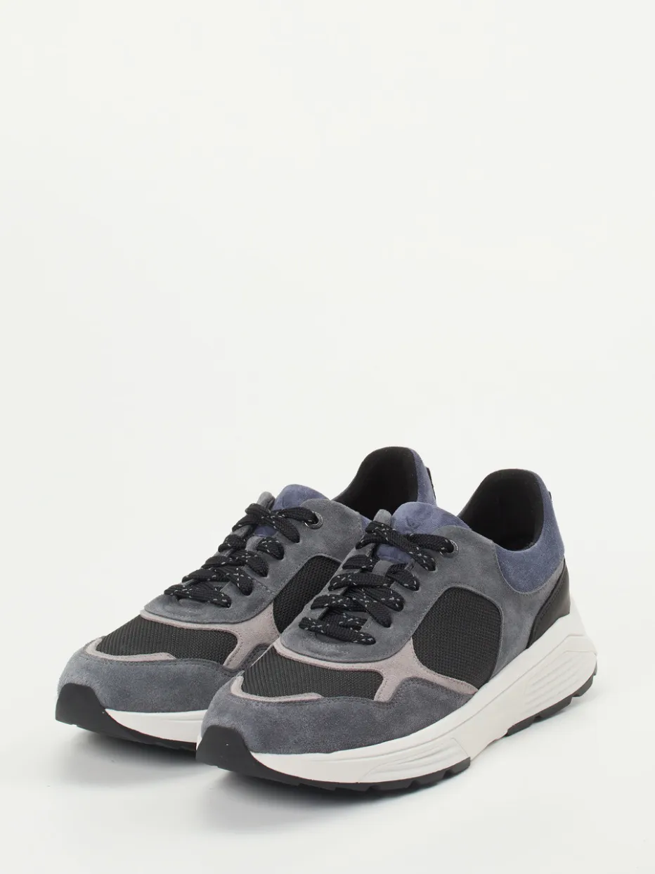 Perfekt für urban aktive Tage überzeugt der Schuh mit einem Mix aus blaugrauem Veloursleder und strukturiertem Mesh in Anthrazit. Die weich gebürstete Oberfläche verleiht ein edles Finish, während reflektierende Schnürsenkel für Sichtbarkeit sorgen. Die mehrlagige, gedämpfte Chunky-Sohle in Schneeweiß ergänzt den Retro-Runner-Stil und sorgt für rutschfesten Halt. Dezente Farbkontraste in Schieferblau und Hellgrau setzen optische Akzente. Der gepolsterte Schaftrand und die verstärkte Ferse unterstreichen Alltagstauglichkeit und Komfort.
