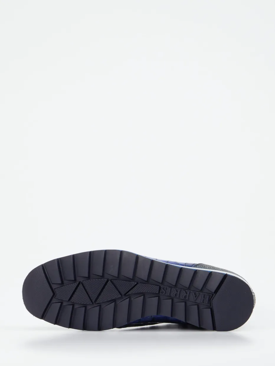 Statement-Design trifft auf urbane Dynamik.Dieser High-Top Sneaker von Harris überzeugt mit sportlich-kompakter Silhouette und modischer Raffinesse. Ideal für expressive Alltags- und Ausgeh-Outfits kombiniert dieses Modell geprägtes Leder in Krokoprägung mit strukturierter Stingray-Optik – beides glänzend inszeniert im intensiven Blau mit silbernem Farbverlauf. Seitliche Reißverschlüsse ermöglichen leichtes Anziehen, silberfarbene Metall-Elemente sorgen für zusätzliche Highlights. Die profilierte Streifensohle unterstreicht den Streetstyle-Charakter mit hohem Tragekomfort. Ein Favorit für experimentierfreudige Modeaffine. Handwerkliche Prägung und exklusives Design machen diesen Sneaker zur stilvollen Zumnorde-Edition.