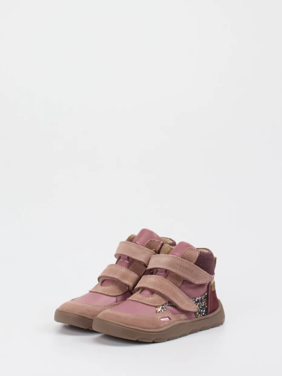 Der High-Top Sneaker von develab kombiniert kindgerechten Komfort mit expressiver Streetwear-Ästhetik. Ideal für lebhafte Tage und kreative Abenteuer bietet das Modell weiches Kalbleder mit samtig strukturierter Veloursoptik, kombiniert mit atmungsaktivem Textilmesh und flexibler Gummisohle. In Altrosa mit bordeauxroten und beigebraunen Akzenten sowie seitlichem Glitzerbesatz überzeugt der Schuh mit kindgerechtem Look und robuster Verarbeitung. Breite Klettverschlüsse und Zuglasche erleichtern das Anziehen. Die rutschhemmende Profilsohle sorgt für sicheren Halt – ob draußen oder zuhause. Perfekt zu Thermo-Leggings oder lässigen Winterjacken. develab verbindet modische Highlights mit alltagsgerechter Funktionalität für kleine Trendsetter.